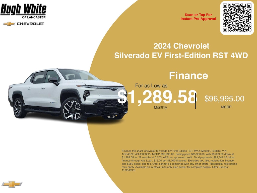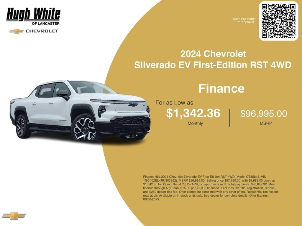 Take advantage of GM Financial programs and Chevrolet Silverado EV First-Edition RST 4WD incentives today. PLUS, choose from 1 more Silverado EV First-Edition RST 4WD options for Lancasterâs best lineup. Finance specials end 11/30/2025. Disclaimer: Finance this 2024 Chevrolet Silverado EV First-Edition RST 4WD (Model CT35843, VIN 1GC40ZEL4RU303362). MSRP $96,995.00. Selling price $85,980.00, with $9,699.00 down at $1,289.58 for 72 months at 6.70% APR, on approved credit. Total payments: $92,849.76. Must finance through Ally Loan. $15.00 per $1,000 financed. Excludes tax, title, registration, license, and $250 dealer doc fee. Offer cannot be combined with any other offers. Residential restrictions may apply. Available on in-stock units only. See dealer for complete details. Offer Expires: 11/30/2025.
