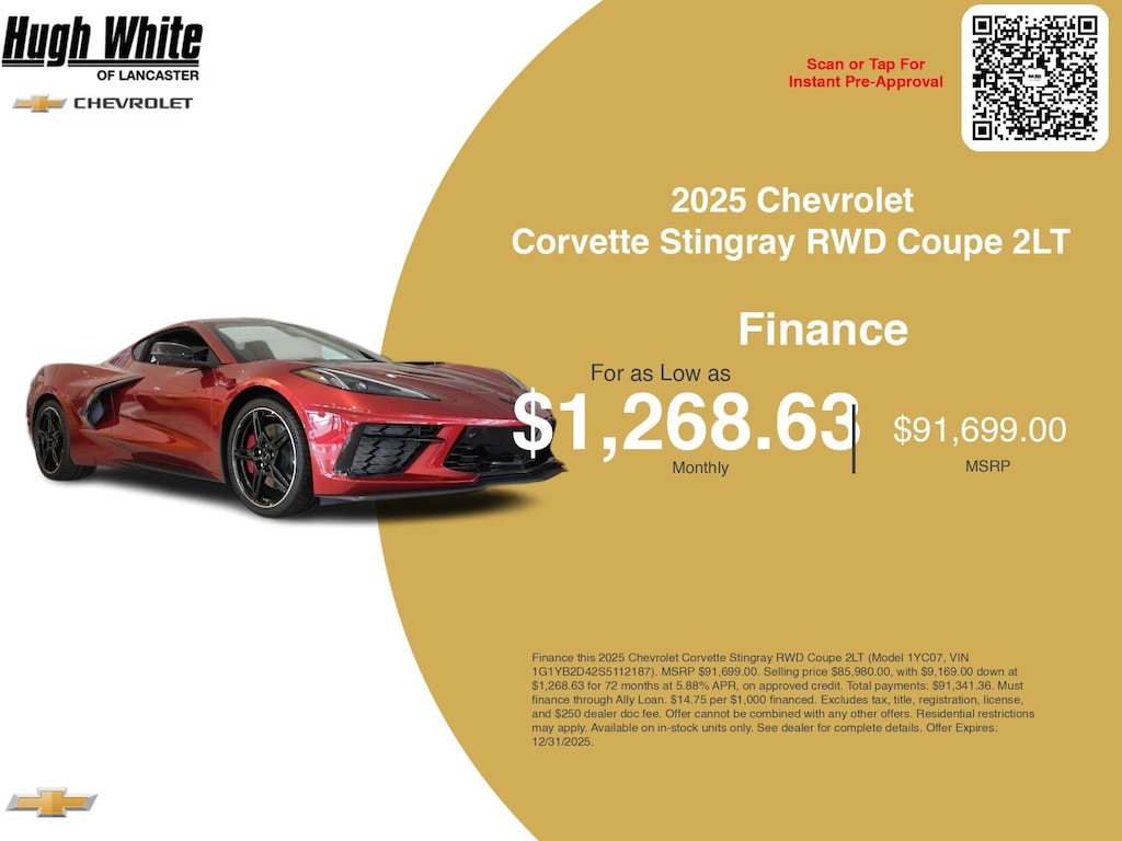 Take advantage of GM Financial programs and Chevrolet Corvette Stingray RWD Coupe 2LT incentives today. PLUS, choose from 1 more Corvette Stingray RWD Coupe 2LT options for Lancasterâs best lineup. Finance specials end 12/31/2025. Disclaimer: Finance this 2025 Chevrolet Corvette Stingray RWD Coupe 2LT (Model 1YC07, VIN 1G1YB2D42S5112187). MSRP $91,699.00. Selling price $85,980.00, with $9,169.00 down at $1,268.63 for 72 months at 5.88% APR, on approved credit. Total payments: $91,341.36. Must finance through Ally Loan. $14.75 per $1,000 financed. Excludes tax, title, registration, license, and $250 dealer doc fee. Offer cannot be combined with any other offers. Residential restrictions may apply. Available on in-stock units only. See dealer for complete details. Offer Expires: 12/31/2025.