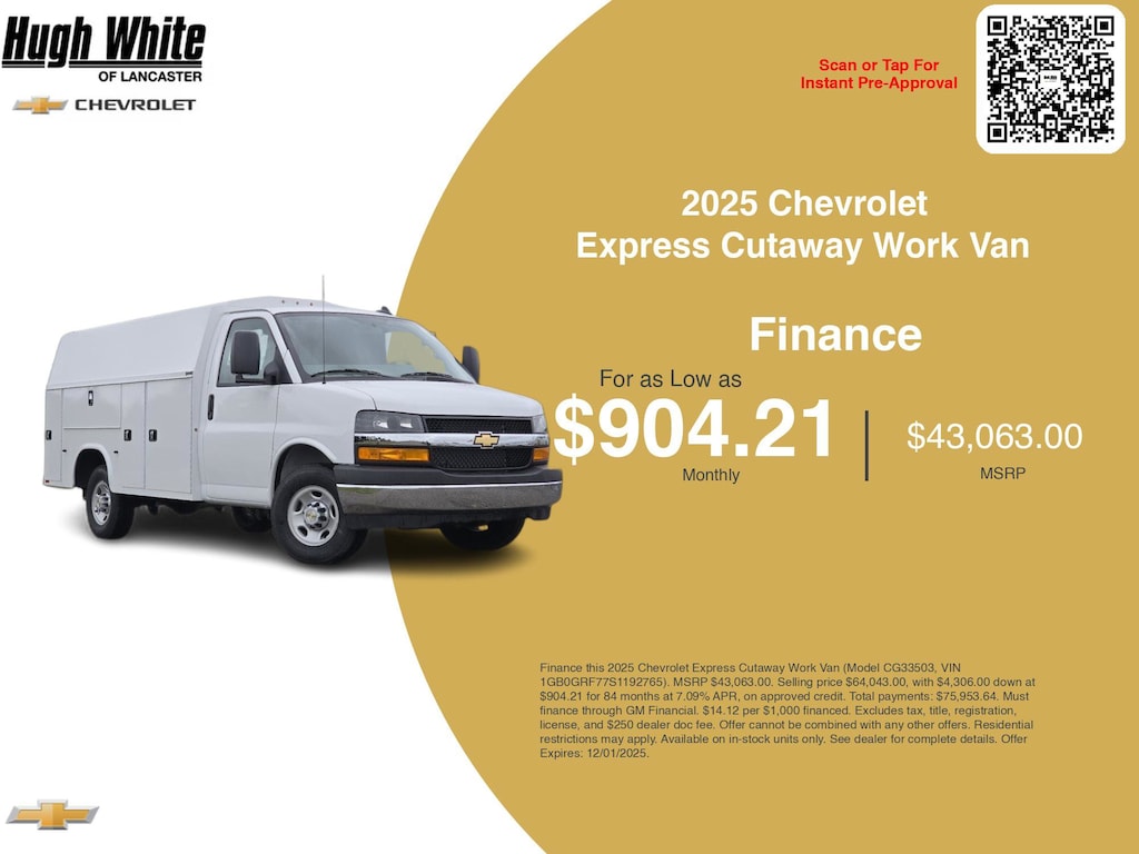 Take advantage of GM Financial programs and Chevrolet Express Cutaway Work Van incentives today. PLUS, choose from 2 more Express Cutaway Work Van options for Lancasterâs best lineup. Finance specials end 12/1/2025. Disclaimer: Finance this 2025 Chevrolet Express Cutaway Work Van (Model CG33503, VIN 1GB0GRF77S1192765). MSRP $43,063.00. Selling price $64,043.00, with $4,306.00 down at $904.21 for 84 months at 7.09% APR, on approved credit. Total payments: $75,953.64. Must finance through GM Financial. $14.12 per $1,000 financed. Excludes tax, title, registration, license, and $250 dealer doc fee. Offer cannot be combined with any other offers. Residential restrictions may apply. Available on in-stock units only. See dealer for complete details. Offer Expires: 12/01/2025.