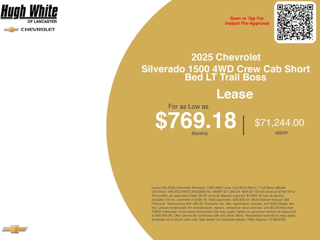 Our GM lease offers combine GM Financial benefits with current Chevrolet Silverado 1500 4WD Crew Cab Short Bed LT Trail Boss incentives. PLUS, explore 1 more Silverado 1500 4WD Crew Cab Short Bed LT Trail Boss options for Lancasterâs best selection. Hurry these GM lease specials end 1/8/2026. Lease this 2025 Chevrolet Silverado 1500 4WD Crew Cab Short Bed LT Trail Boss (Model CK10543; VIN 3GCUKFEL9SG364479). MSRP $71,244.00. With $7,124.00 down at $769.18 for 48 months, on approved credit. $0.00 security deposit required. $7,893.18 due at signing - includes 1st mo. payment of $769.18. Total payments: $36,920.64. Must finance through GM Financial. Selling price $67,495.00. Excludes tax, title, registration, license, and $250 dealer doc fee. Lessee responsible for maintenance, repairs, excessive wear and tear, and $0.25/mile over 10000 miles/year. Early lease termination fee may apply. Option to purchase vehicle at lease end is $40,609.08. Offer cannot be combined with any other offers. Residential restrictions may apply. Available on in-stock units only. See dealer for complete details. Offer Expires: 01/08/2026.
