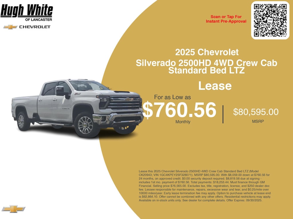 GM lease offers leverage the benefits of GM Financial, along with current Chevrolet Silverado 2500HD 4WD Crew Cab Standard Bed LTZ rebates, and incentives available. PLUS, we have 2 other Silverado 2500HD 4WD Crew Cab Standard Bed LTZ options for Lancaster's best selection. Call or drive in for Chevrolet lease deals like this attractive 2025 Chevrolet Silverado 2500HD with lease options near Lancaster! This Silverado 2500HD is also available for sale near Pickerington, Circleville, and Logan. These GM lease offers end 9/30/2025 Disclaimer: Lease this 2025 Chevrolet Silverado 2500HD 4WD Crew Cab Standard Bed LTZ (Model CK20943; VIN 1GC4KPEY2SF328071). MSRP $80,595.00. With $8,059.00 down at $760.56 for 24 months, on approved credit. $0.00 security deposit required. $8,819.56 due at signing - includes 1st mo. payment of $760.56. Total payments: $18,253.44. Must finance through GM Financial. Selling price $76,565.00. Excludes tax, title, registration, license, and $250 dealer doc fee. Lessee responsible for maintenance, repairs, excessive wear and tear, and $0.25/mile over 10000 miles/year. Early lease termination fee may apply. Option to purchase vehicle at lease end is $62,864.10. Offer cannot be combined with any other offers. Residential restrictions may apply. Available on in-stock units only. See dealer for complete details. Offer Expires: 09/30/2025.