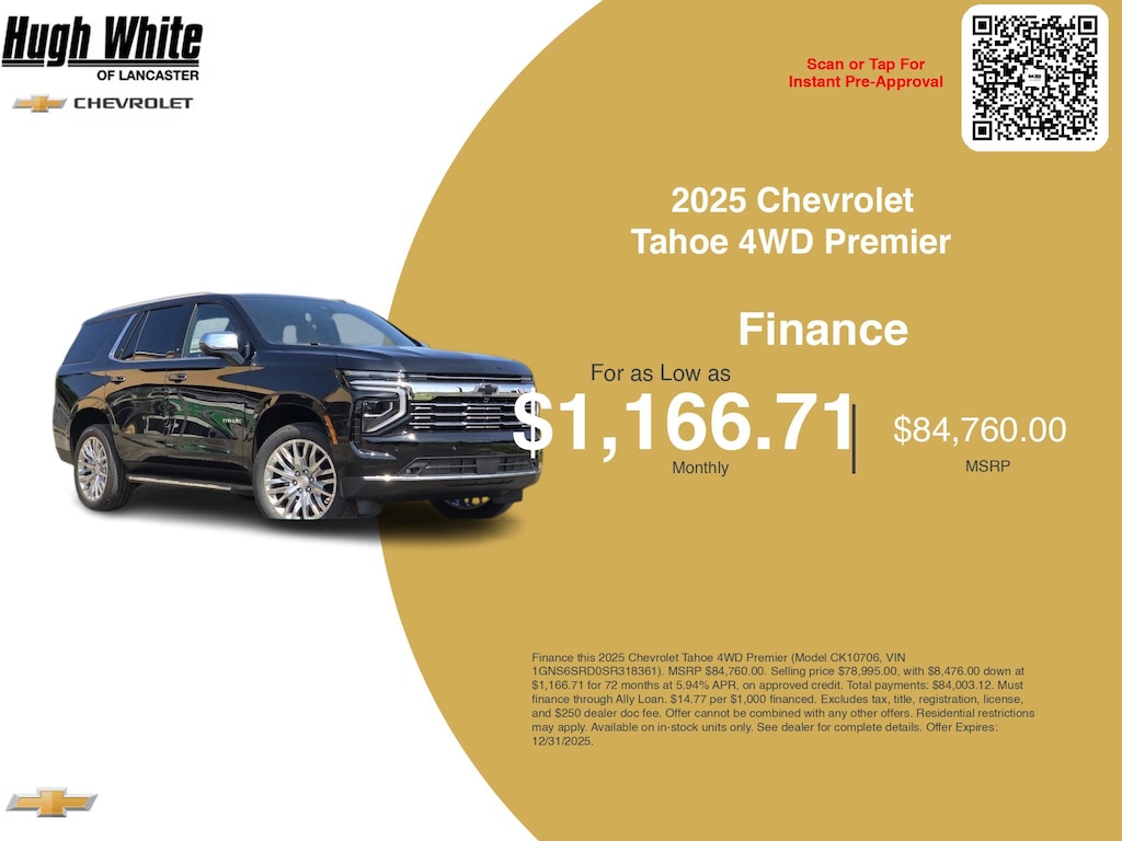 Take advantage of GM Financial programs and Chevrolet Tahoe 4WD Premier incentives today. PLUS, choose from 3 more Tahoe 4WD Premier options for Lancasterâs best lineup. Finance specials end 12/31/2025. Disclaimer: Finance this 2025 Chevrolet Tahoe 4WD Premier (Model CK10706, VIN 1GNS6SRD0SR318361). MSRP $84,760.00. Selling price $78,995.00, with $8,476.00 down at $1,166.71 for 72 months at 5.94% APR, on approved credit. Total payments: $84,003.12. Must finance through Ally Loan. $14.77 per $1,000 financed. Excludes tax, title, registration, license, and $250 dealer doc fee. Offer cannot be combined with any other offers. Residential restrictions may apply. Available on in-stock units only. See dealer for complete details. Offer Expires: 12/31/2025.