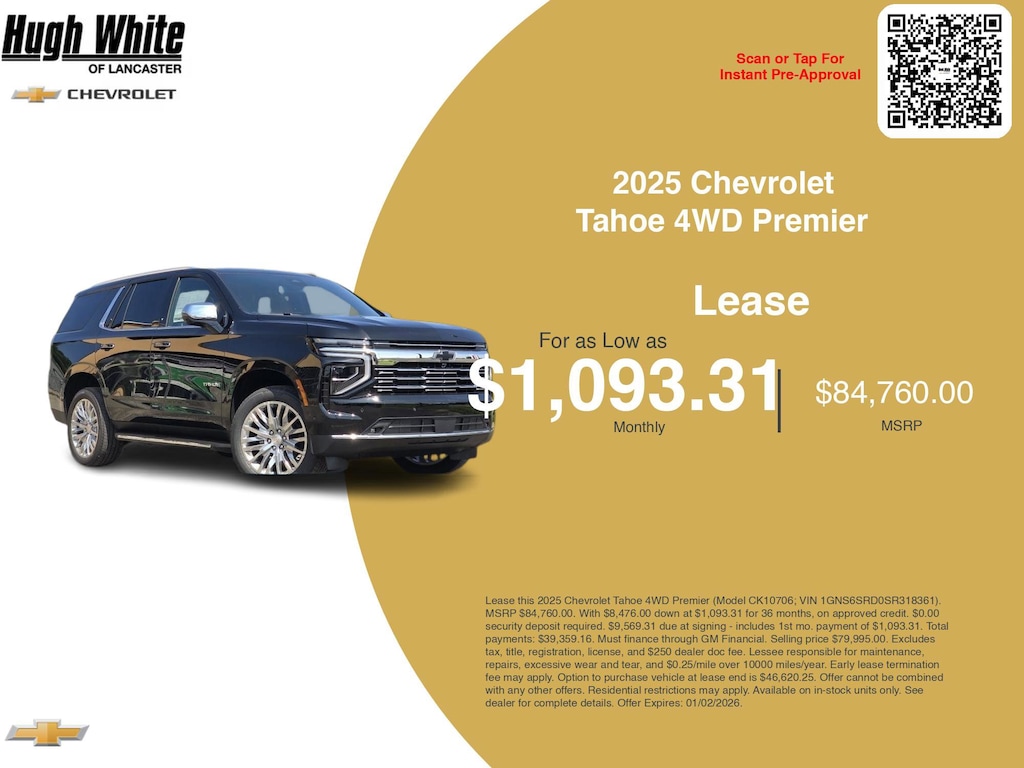 Our GM lease offers combine GM Financial benefits with current Chevrolet Tahoe 4WD Premier incentives. PLUS, explore 3 more Tahoe 4WD Premier options for Lancasterâs best selection. Hurry these GM lease specials end 1/2/2026. Lease this 2025 Chevrolet Tahoe 4WD Premier (Model CK10706; VIN 1GNS6SRD0SR318361). MSRP $84,760.00. With $8,476.00 down at $1,093.31 for 36 months, on approved credit. $0.00 security deposit required. $9,569.31 due at signing - includes 1st mo. payment of $1,093.31. Total payments: $39,359.16. Must finance through GM Financial. Selling price $79,995.00. Excludes tax, title, registration, license, and $250 dealer doc fee. Lessee responsible for maintenance, repairs, excessive wear and tear, and $0.25/mile over 10000 miles/year. Early lease termination fee may apply. Option to purchase vehicle at lease end is $46,620.25. Offer cannot be combined with any other offers. Residential restrictions may apply. Available on in-stock units only. See dealer for complete details. Offer Expires: 01/02/2026.