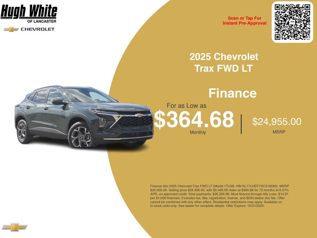 This and other GM finance offers leverage the benefits of GM Financial, along with current Chevrolet Trax FWD LT rebates, and incentives available. PLUS, we have 5 other Trax FWD LT options for Lancaster's best selection. Call or drive for Chevrolet finance deals like this stunning 2025 Chevrolet Trax with finance options near Lancaster! This Trax is also available for sale near Pickerington, Circleville, and Logan. These GM finance specials end 10/31/2025 Disclaimer: Finance this 2025 Chevrolet Trax FWD LT (Model 1TU58, VIN KL77LHEP7SC318285). MSRP $24,955.00. Selling price $24,456.00, with $2,495.00 down at $364.68 for 72 months at 6.07% APR, on approved credit. Total payments: $26,256.96. Must finance through Ally Loan. $14.91 per $1,000 financed. Excludes tax, title, registration, license, and $250 dealer doc fee. Offer cannot be combined with any other offers. Residential restrictions may apply. Available on in-stock units only. See dealer for complete details. Offer Expires: 10/31/2025.