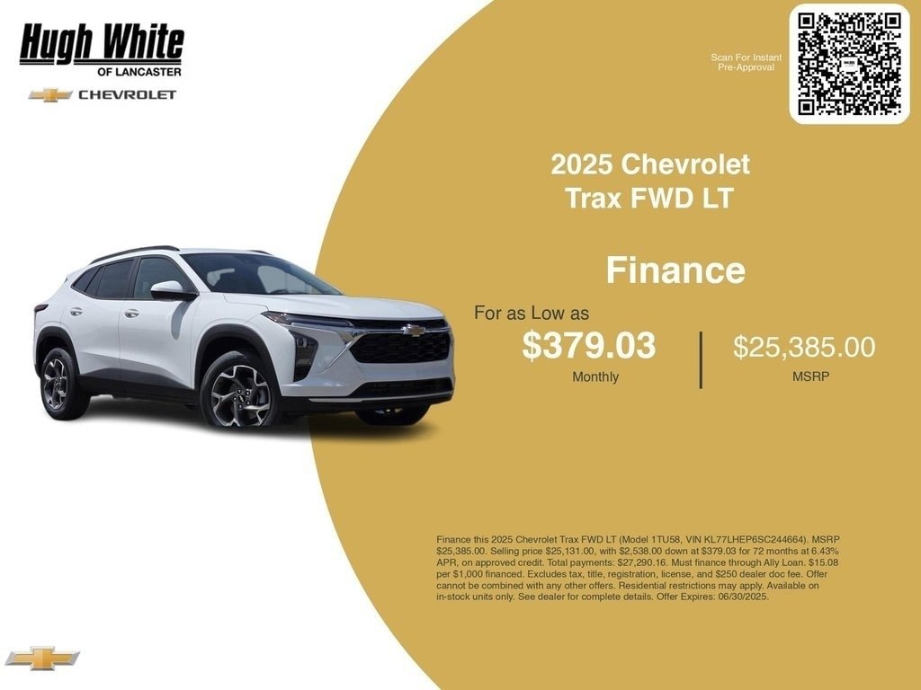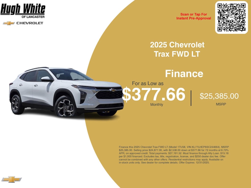 Take advantage of GM Financial programs and Chevrolet Trax FWD LT incentives today. PLUS, choose from 6 more Trax FWD LT options for Lancasterâs best lineup. Finance specials end 12/31/2025. Disclaimer: Finance this 2025 Chevrolet Trax FWD LT (Model 1TU58, VIN KL77LHEP6SC244664). MSRP $25,385.00. Selling price $24,877.00, with $2,538.00 down at $377.66 for 72 months at 6.70% APR, on approved credit. Total payments: $27,191.52. Must finance through Ally Loan. $15.18 per $1,000 financed. Excludes tax, title, registration, license, and $250 dealer doc fee. Offer cannot be combined with any other offers. Residential restrictions may apply. Available on in-stock units only. See dealer for complete details. Offer Expires: 12/31/2025.