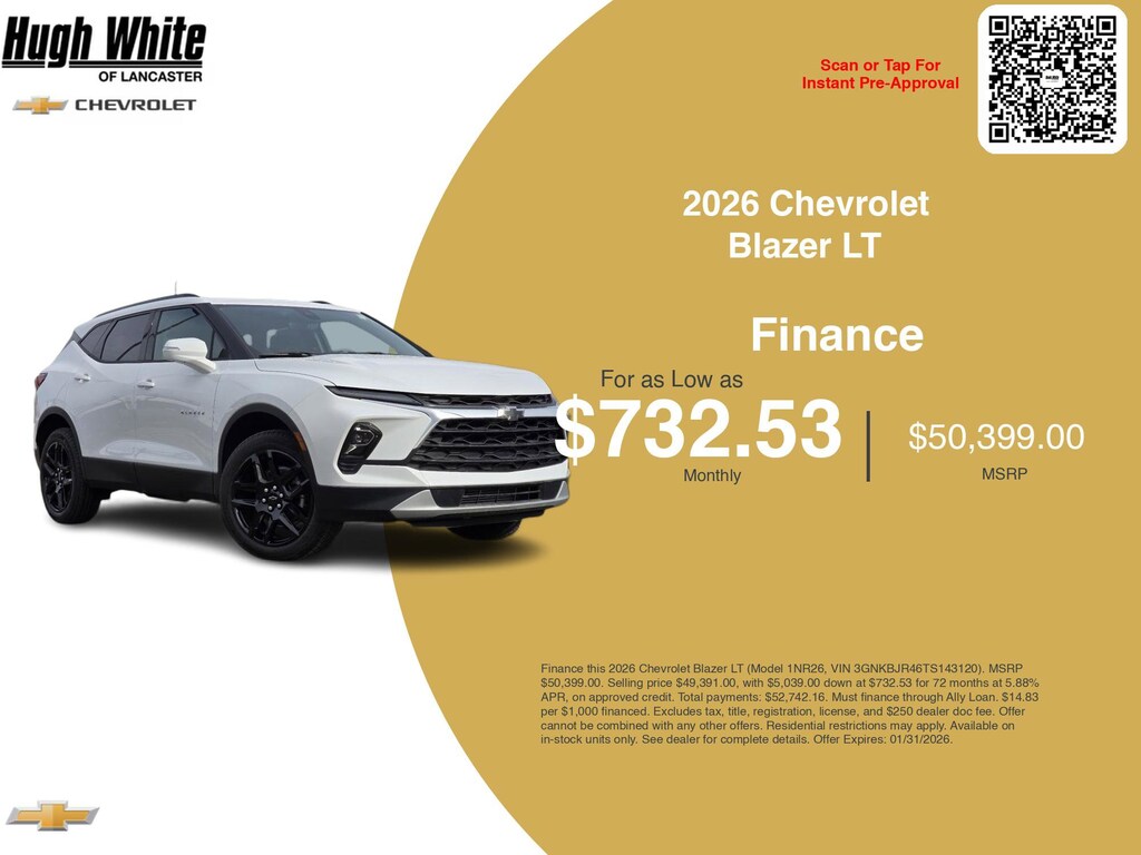 Take advantage of GM Financial programs and Chevrolet Blazer LT incentives today. PLUS, choose from 1 more Blazer LT options for Lancasterâs best lineup. Finance specials end 1/31/2026. Disclaimer: Finance this 2026 Chevrolet Blazer LT (Model 1NR26, VIN 3GNKBJR46TS143120). MSRP $50,399.00. Selling price $49,391.00, with $5,039.00 down at $732.53 for 72 months at 5.88% APR, on approved credit. Total payments: $52,742.16. Must finance through Ally Loan. $14.83 per $1,000 financed. Excludes tax, title, registration, license, and $250 dealer doc fee. Offer cannot be combined with any other offers. Residential restrictions may apply. Available on in-stock units only. See dealer for complete details. Offer Expires: 01/31/2026.