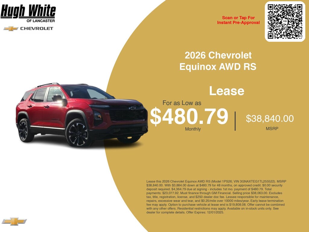 Our GM lease offers combine GM Financial benefits with current Chevrolet Equinox AWD RS incentives. PLUS, explore 6 more Equinox AWD RS options for Lancasterâs best selection. Hurry these GM lease specials end 12/1/2025. Lease this 2026 Chevrolet Equinox AWD RS (Model 1PS26; VIN 3GNAXTEG1TL255522). MSRP $38,840.00. With $3,884.00 down at $480.79 for 48 months, on approved credit. $0.00 security deposit required. $4,364.79 due at signing - includes 1st mo. payment of $480.79. Total payments: $23,077.92. Must finance through GM Financial. Selling price $38,063.00. Excludes tax, title, registration, license, and $250 dealer doc fee. Lessee responsible for maintenance, repairs, excessive wear and tear, and $0.25/mile over 10000 miles/year. Early lease termination fee may apply. Option to purchase vehicle at lease end is $19,808.08. Offer cannot be combined with any other offers. Residential restrictions may apply. Available on in-stock units only. See dealer for complete details. Offer Expires: 12/01/2025.