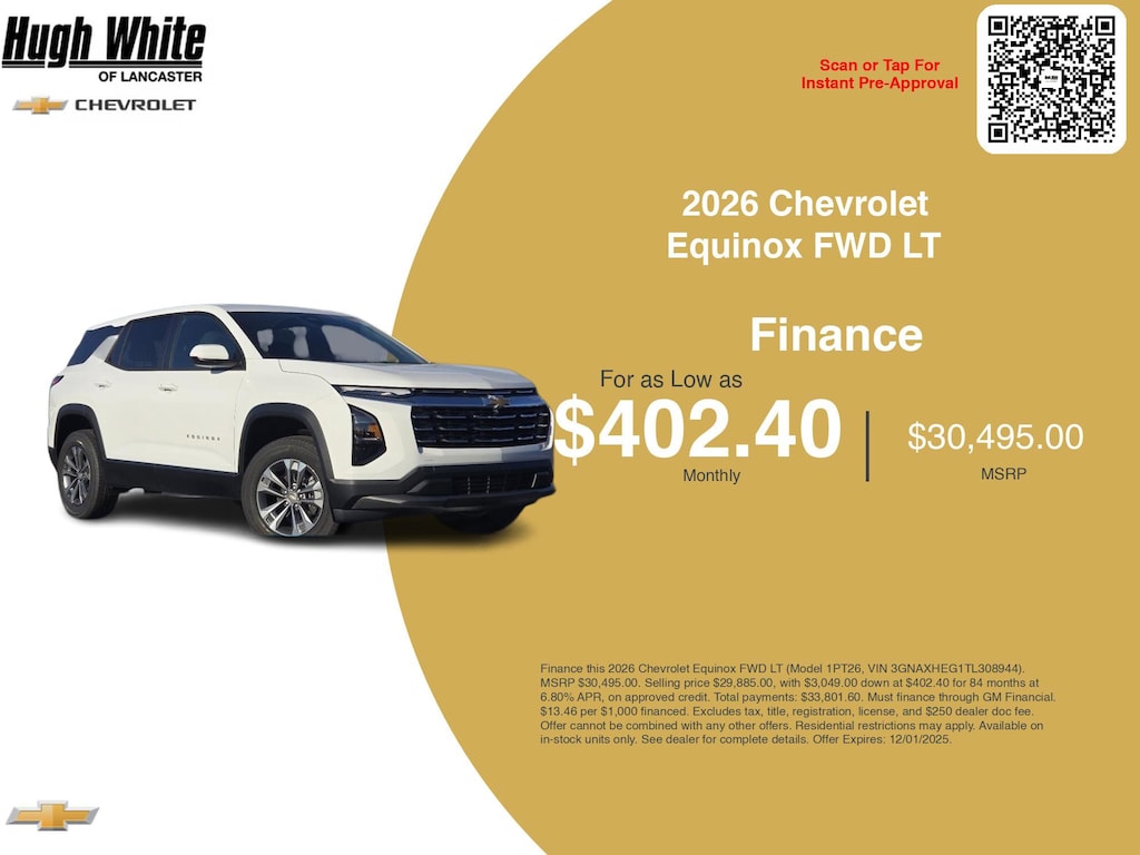 Take advantage of GM Financial programs and Chevrolet Equinox FWD LT incentives today. PLUS, choose from 3 more Equinox FWD LT options for Lancasterâs best lineup. Finance specials end 12/1/2025. Disclaimer: Finance this 2026 Chevrolet Equinox FWD LT (Model 1PT26, VIN 3GNAXHEG1TL308944). MSRP $30,495.00. Selling price $29,885.00, with $3,049.00 down at $402.40 for 84 months at 6.80% APR, on approved credit. Total payments: $33,801.60. Must finance through GM Financial. $13.46 per $1,000 financed. Excludes tax, title, registration, license, and $250 dealer doc fee. Offer cannot be combined with any other offers. Residential restrictions may apply. Available on in-stock units only. See dealer for complete details. Offer Expires: 12/01/2025.