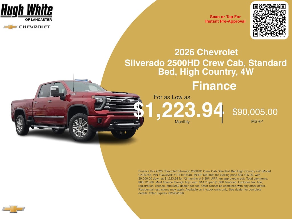 Take advantage of GM Financial programs and Chevrolet Silverado 2500HD Crew Cab, Standard Bed, High Country, 4W incentives today. PLUS, choose from 3 more Silverado 2500HD Crew Cab, Standard Bed, High Country, 4W options for Lancasterâs best lineup. Finance specials end 2/28/2026. Disclaimer: Finance this 2026 Chevrolet Silverado 2500HD Crew Cab Standard Bed High Country 4W (Model CK20743, VIN 1GC4KREY1TF161408). MSRP $90,005.00. Selling price $83,105.00, with $9,000.00 down at $1,223.94 for 72 months at 5.88% APR, on approved credit. Total payments: $88,123.68. Must finance through Ally Loan. $14.73 per $1,000 financed. Excludes tax, title, registration, license, and $250 dealer doc fee. Offer cannot be combined with any other offers. Residential restrictions may apply. Available on in-stock units only. See dealer for complete details. Offer Expires: 02/28/2026.