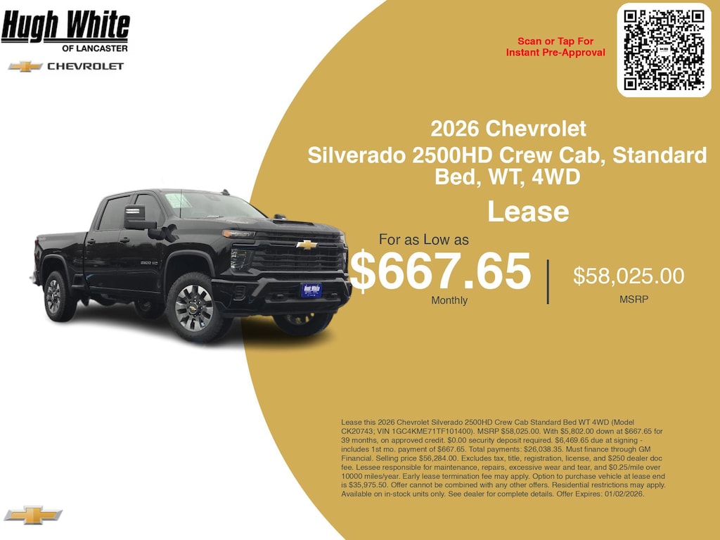 Our GM lease offers combine GM Financial benefits with current Chevrolet Silverado 2500HD Crew Cab, Standard Bed, WT, 4WD incentives. PLUS, explore 5 more Silverado 2500HD Crew Cab, Standard Bed, WT, 4WD options for Lancasterâs best selection. Hurry these GM lease specials end 1/2/2026. Lease this 2026 Chevrolet Silverado 2500HD Crew Cab Standard Bed WT 4WD (Model CK20743; VIN 1GC4KME71TF101400). MSRP $58,025.00. With $5,802.00 down at $667.65 for 39 months, on approved credit. $0.00 security deposit required. $6,469.65 due at signing - includes 1st mo. payment of $667.65. Total payments: $26,038.35. Must finance through GM Financial. Selling price $56,284.00. Excludes tax, title, registration, license, and $250 dealer doc fee. Lessee responsible for maintenance, repairs, excessive wear and tear, and $0.25/mile over 10000 miles/year. Early lease termination fee may apply. Option to purchase vehicle at lease end is $35,975.50. Offer cannot be combined with any other offers. Residential restrictions may apply. Available on in-stock units only. See dealer for complete details. Offer Expires: 01/02/2026.