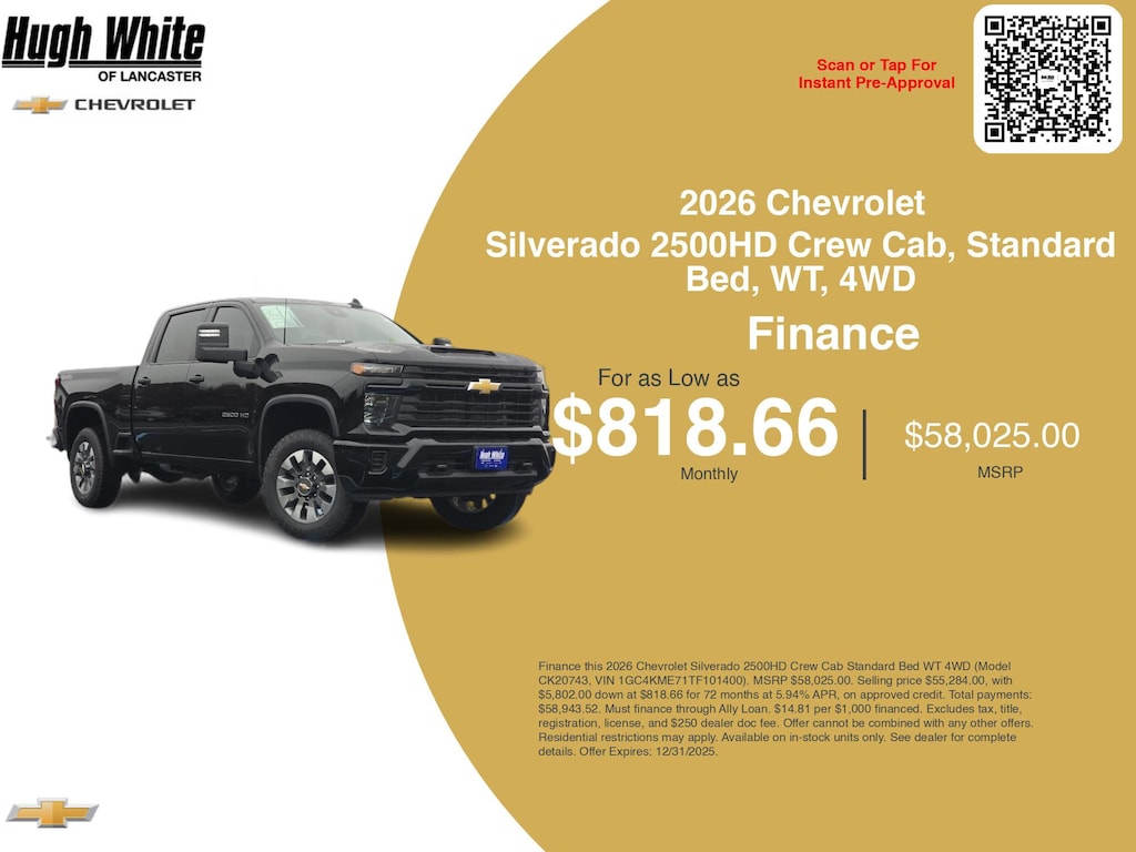 Take advantage of GM Financial programs and Chevrolet Silverado 2500HD Crew Cab, Standard Bed, WT, 4WD incentives today. PLUS, choose from 5 more Silverado 2500HD Crew Cab, Standard Bed, WT, 4WD options for Lancasterâs best lineup. Finance specials end 12/31/2025. Disclaimer: Finance this 2026 Chevrolet Silverado 2500HD Crew Cab Standard Bed WT 4WD (Model CK20743, VIN 1GC4KME71TF101400). MSRP $58,025.00. Selling price $55,284.00, with $5,802.00 down at $818.66 for 72 months at 5.94% APR, on approved credit. Total payments: $58,943.52. Must finance through Ally Loan. $14.81 per $1,000 financed. Excludes tax, title, registration, license, and $250 dealer doc fee. Offer cannot be combined with any other offers. Residential restrictions may apply. Available on in-stock units only. See dealer for complete details. Offer Expires: 12/31/2025.