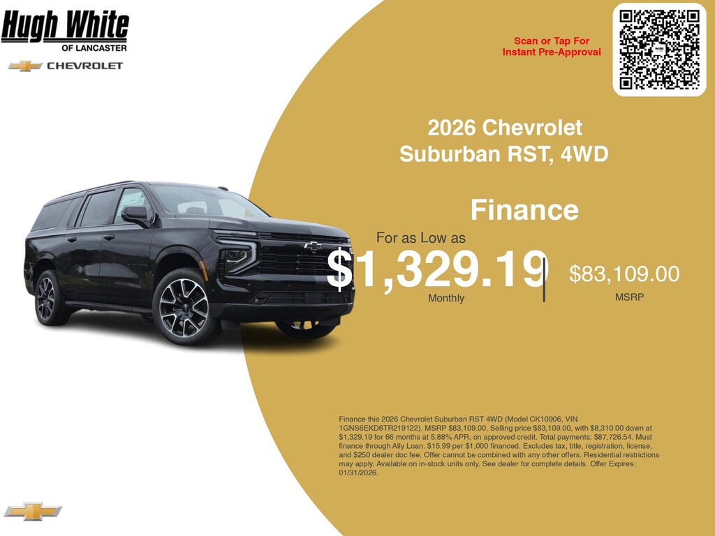 Take advantage of GM Financial programs and Chevrolet Suburban RST, 4WD incentives today. PLUS, choose from 1 more Suburban RST, 4WD options for Lancasterâs best lineup. Finance specials end 1/31/2026. Disclaimer: Finance this 2026 Chevrolet Suburban RST 4WD (Model CK10906, VIN 1GNS6EKD6TR219122). MSRP $83,109.00. Selling price $83,109.00, with $8,310.00 down at $1,329.19 for 66 months at 5.88% APR, on approved credit. Total payments: $87,726.54. Must finance through Ally Loan. $15.99 per $1,000 financed. Excludes tax, title, registration, license, and $250 dealer doc fee. Offer cannot be combined with any other offers. Residential restrictions may apply. Available on in-stock units only. See dealer for complete details. Offer Expires: 01/31/2026.