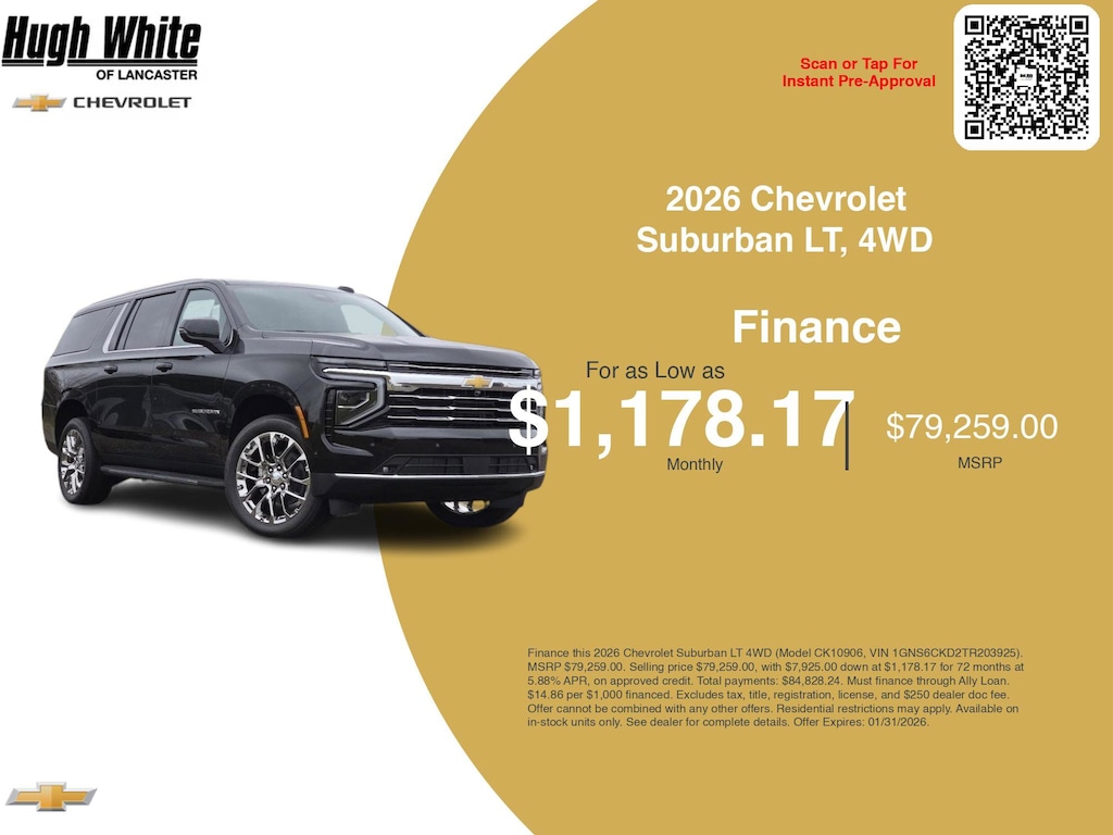 Take advantage of GM Financial programs and Chevrolet Suburban LT, 4WD incentives today. PLUS, choose from 1 more Suburban LT, 4WD options for Lancasterâs best lineup. Finance specials end 1/31/2026. Disclaimer: Finance this 2026 Chevrolet Suburban LT 4WD (Model CK10906, VIN 1GNS6CKD2TR203925). MSRP $79,259.00. Selling price $79,259.00, with $7,925.00 down at $1,178.17 for 72 months at 5.88% APR, on approved credit. Total payments: $84,828.24. Must finance through Ally Loan. $14.86 per $1,000 financed. Excludes tax, title, registration, license, and $250 dealer doc fee. Offer cannot be combined with any other offers. Residential restrictions may apply. Available on in-stock units only. See dealer for complete details. Offer Expires: 01/31/2026.