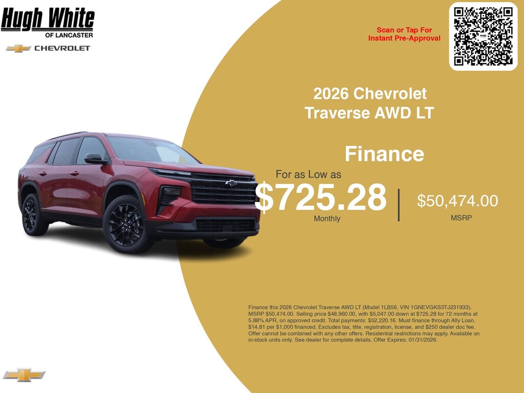 Take advantage of GM Financial programs and Chevrolet Traverse AWD LT incentives today. PLUS, choose from 3 more Traverse AWD LT options for Lancasterâs best lineup. Finance specials end 1/31/2026. Disclaimer: Finance this 2026 Chevrolet Traverse AWD LT (Model 1LB56, VIN 1GNEVGKS3TJ231933). MSRP $50,474.00. Selling price $48,960.00, with $5,047.00 down at $725.28 for 72 months at 5.88% APR, on approved credit. Total payments: $52,220.16. Must finance through Ally Loan. $14.81 per $1,000 financed. Excludes tax, title, registration, license, and $250 dealer doc fee. Offer cannot be combined with any other offers. Residential restrictions may apply. Available on in-stock units only. See dealer for complete details. Offer Expires: 01/31/2026.