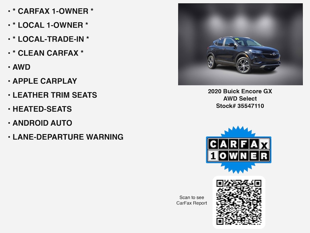 CARFAX VERIFIED 1-OWNER. Free CARFAX report! DESIRABLE FEATURES: * CARFAX 1-OWNER *, * CLEAN CARFAX *, * LOCAL-TRADE-IN *, * LOCAL 1-OWNER *, LEATHER TRIM SEATS, APPLE CARPLAY, AWD, ANDROID AUTO, HEATED-SEATS, LANE-DEPARTURE WARNING, BLUETOOTH, BACKUP CAMERA, MULTI-ZONE AC, ALLOY-WHEELS, FOG LAMPS, SiriusXM, usb, Remote entry. Your 2020 Buick Encore GX AWD Select is perfect for daily work or weekend road trips to our neighboring communities of Lancaster, Columbus, Newark, Pickerington, and Logan.Hugh White Chevrolet of Lancaster also offers extended vehicle service contracts so our Lancaster, OH area drivers enjoy a worry-free used car, SUV or van ownership experience. We proudly serve the counties of Fairfield, Hocking, Perry, Licking, and Pickaway with quality pre-owned vehicles Ohio drivers can trust.