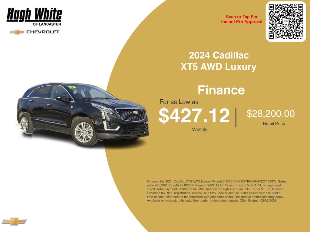 This and other GM finance offers leverage the benefits of GM Financial. Call or drive in for GM finance deals like this stunning 2024 Cadillac XT5 with finance options near Lancaster! This XT5 is also available for sale near Pickerington, Circleville, and Logan. These GM finance specials end 2/28/2026 Disclaimer: Finance this 2024 Cadillac XT5 AWD Luxury (Model 6NF26, VIN 1GYKNBR45RZ716987). Selling price $28,200.00, with $2,820.00 down at $427.12 for 72 months at 6.54% APR, on approved credit. Total payments: $30,752.64. Must finance through Ally Loan. $15.15 per $1,000 financed. Excludes tax, title, registration, license, and $250 dealer doc fee. Offer assumes these paid at time of sale. Offer cannot be combined with any other offers. Residential restrictions may apply. Available on in-stock units only. See dealer for complete details. Offer Expires: 02/28/2026.