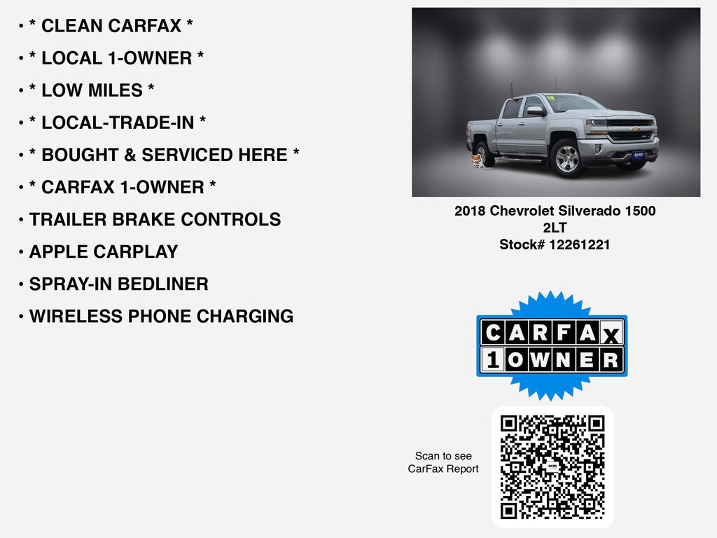 ===== Discover Chevrolet Silverado 1500 2LT Exceptional Savings at Hugh White Chevrolet Lancaster! =====If you are ready to finance your next used vehicle near Lancaster, Pickerington, Circleville, and Logan, Hugh White Chevrolet Lancaster is thrilled to offer you a competitive finance offer on this 2018 Chevrolet Silverado 1500 2LT. Here is how the monthly payment of $401.65 is calculated for well qualified buyers shopping Hugh White Chevrolet Lancaster with Tier 1 credit: * Total Due at Signing: $2,584.00 * Security Deposit: $0.00 * Total Payments: $28,918.80 over the loan term * Loan Term: 72 months * Vehicle Price: $25,847.00This and other GM finance offers leverage the benefits of GM Financial. Call or drive in for GM finance deals like this stunning 2018 Chevrolet Silverado 1500 with finance options near Lancaster! This Silverado 1500 is also available for sale near Pickerington, Circleville, and Logan. These GM finance specials end 1/31/2026 Disclaimer: Finance this 2018 Chevrolet Silverado 1500 2LT (Model CK15543, VIN 3GCUKREC5JG400538). Selling price $25,847.00, with $2,584.00 down at $401.65 for 72 months at 7.45% APR, on approved credit. Total payments: $28,918.80. Must finance through Ally Loan. $15.54 per $1,000 financed. Excludes tax, title, registration, license, and $250 dealer doc fee. Offer assumes these paid at time of sale. Offer cannot be combined with any other offers. Residential restrictions may apply. Available on in-stock units only. See dealer for complete details. Offer Expires: 01/31/2026.CARFAX VERIFIED 1-OWNER. Free CARFAX report! *DESIRABLE FEATURES:* * LOCAL 1-OWNER *, * BOUGHT & SERVICED HERE *, * CLEAN CARFAX *, * LOCAL-TRADE-IN *, * LOW MILES *, * CARFAX 1-OWNER *, SPRAY-IN BEDLINER, TRAILER BRAKE CONTROLS, APPLE CARPLAY, 4X4, ANDROID AUTO, WIRELESS PHONE CHARGING, HEATED-SEATS, REMOTE START, TOW PKG, BLUETOOTH, MULTI-ZONE AC, BACKUP CAMERA, RUNNING-BOARDS, FOG LAMPS, ALLOY-WHEELS, SiriusXM, Remote entry. Your 2018 Chevrolet Silverado 1500 2LT is perfect for daily work or weekend road trips to our neighboring communities of Lancaster, Columbus, Newark, Pickerington, and Logan.Hugh White Chevrolet of Lancaster also offers extended vehicle service contracts so our Lancaster, OH area drivers enjoy a worry-free used car, SUV or van ownership experience. We proudly serve the counties of Fairfield, Hocking, Perry, Licking, and Pickaway with quality pre-owned vehicles Ohio drivers can trust.This 4x4 2018 Chevrolet Silverado 1500 2LT has 88,782 miles and a bold Silver Ice Metallic exterior with a comfortable Black Interior.*Our Car Dealership in Lancaster, OH:* Call Hugh White Chevrolet of Lancaster today at *(740) 640-6850 TO SCHEDULE YOUR TEST DRIVE* of this 2018 Chevrolet Silverado 1500 2LT. You can also visit us at 2510 N Memorial Dr. Lancaster, OH 45701 to check it out in person!*MECHANICAL FEATURES:* This Chevrolet Silverado 1500 comes factory equipped with an impressive ecotec3 5.3l v8 engine, and a 6-speed automatic electronic with overdrive transmission. Hugh White Chevrolet of Lancaster is southern Ohio's location where you can test drive a GM certified vehicle and depend on us for service, parts, and accessories. We serve drivers from Pickerington, Circleville, Logan, and throughout Hocking and Perry County.*SAFETY OPTIONS:* Electronic Stability Control, HID Headlamps, Brake Assist, Speed Sensitive Power Steering, Dual Air Bags, Overhead airbag, Tire Pressure Monitoring System, Delay-off headlights, ABS Brakes, Passenger Air Bag Sensor, Driver Front Side Impact Air Bag, Low tire pressure warning. This 2018 Chevrolet Silverado 1500 2LT comes standard with peace of mind for any driving conditionsWhen shopping for used cars, shoppers prefer the short drive to Lancaster. We're glad you found this pre-owned Chevrolet Silverado 1500 for sale at our car dealership in Lancaster, OH. Looking for financing? Our Hugh White Chevrolet of Lancaster finance specialists will find the best rates avai