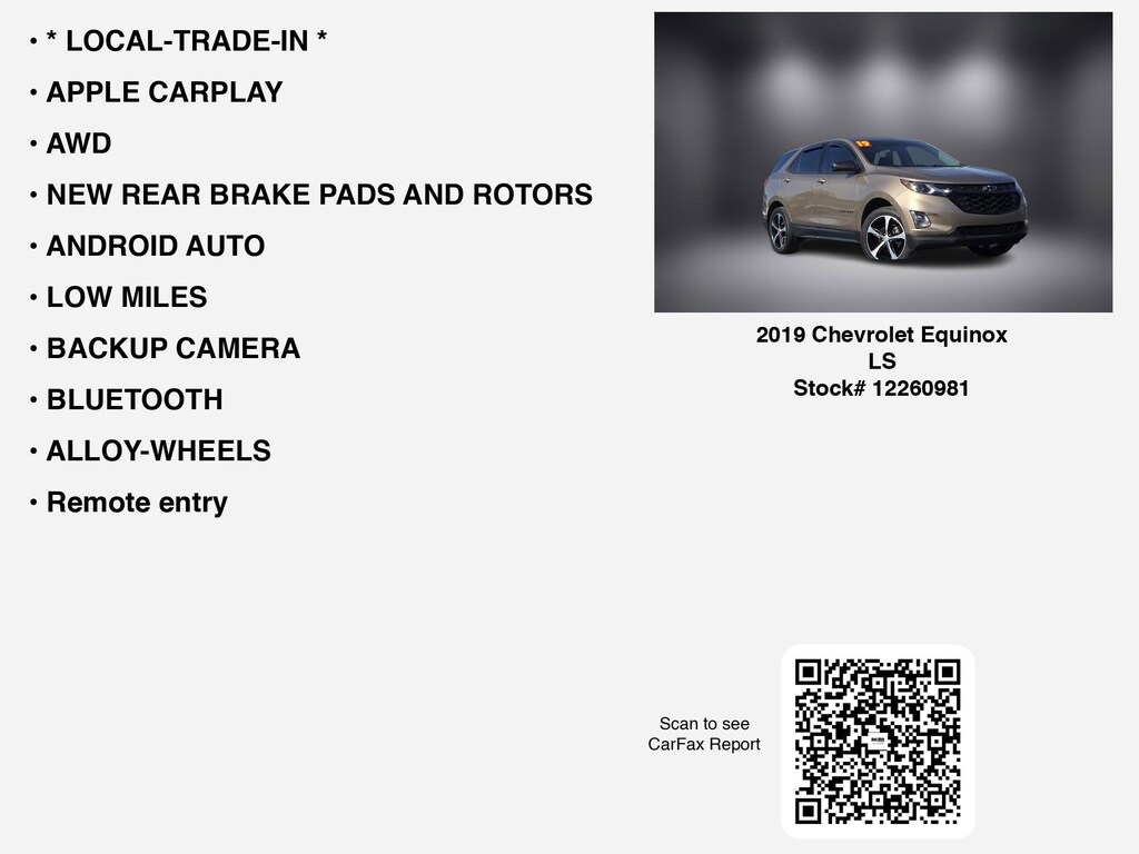 Free CARFAX report! DESIRABLE FEATURES: * LOCAL-TRADE-IN *, NEW REAR BRAKE PADS AND ROTORS, AWD, APPLE CARPLAY, ANDROID AUTO, LOW MILES, BLUETOOTH, BACKUP CAMERA, ALLOY-WHEELS, Remote entry, usb. Your 2019 Chevrolet Equinox LS is perfect for daily work or weekend road trips to our neighboring communities of Lancaster, Columbus, Newark, Pickerington, and Logan.Hugh White Chevrolet of Lancaster also offers extended vehicle service contracts so our Lancaster, OH area drivers enjoy a worry-free used car, SUV or van ownership experience. We proudly serve the counties of Fairfield, Hocking, Perry, Licking, and Pickaway with quality pre-owned vehicles Ohio drivers can trust.