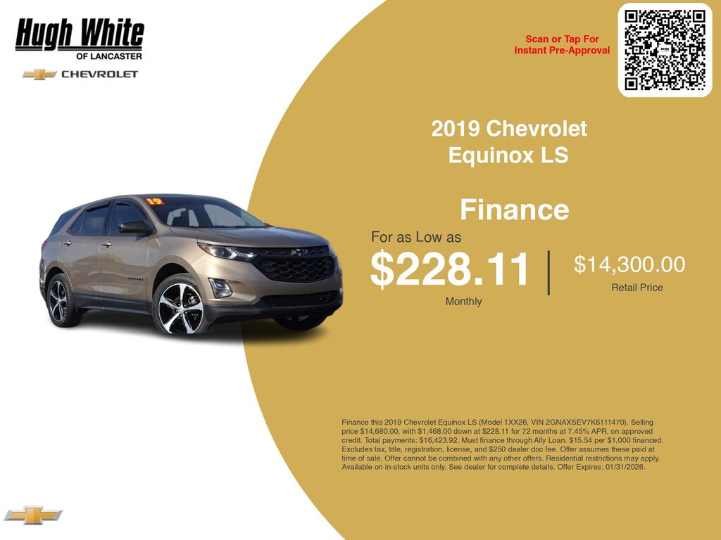 This and other GM finance offers leverage the benefits of GM Financial. Call or drive in for GM finance deals like this stunning 2019 Chevrolet Equinox with finance options near Lancaster! This Equinox is also available for sale near Pickerington, Circleville, and Logan. These GM finance specials end 1/31/2026 Disclaimer: Finance this 2019 Chevrolet Equinox LS (Model 1XX26, VIN 2GNAXSEV7K6111470). Selling price $14,680.00, with $1,468.00 down at $228.11 for 72 months at 7.45% APR, on approved credit. Total payments: $16,423.92. Must finance through Ally Loan. $15.54 per $1,000 financed. Excludes tax, title, registration, license, and $250 dealer doc fee. Offer assumes these paid at time of sale. Offer cannot be combined with any other offers. Residential restrictions may apply. Available on in-stock units only. See dealer for complete details. Offer Expires: 01/31/2026.