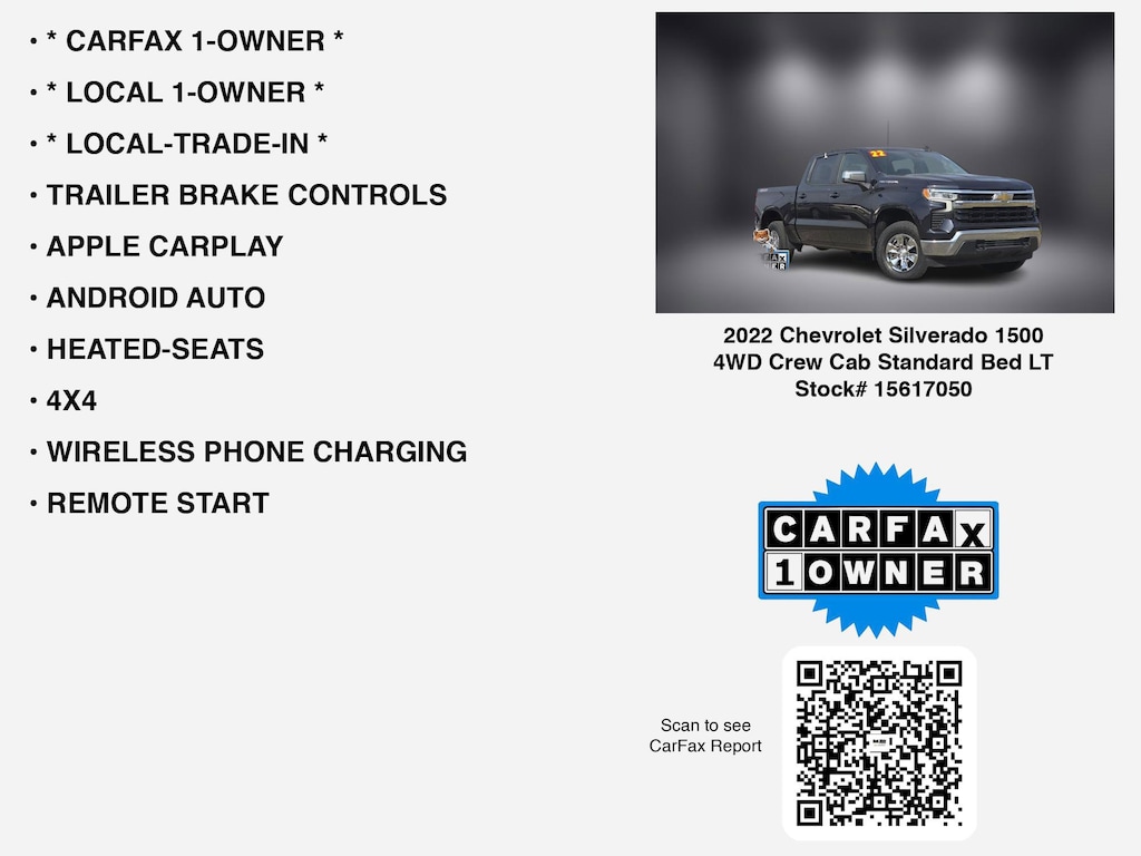 CARFAX VERIFIED 1-OWNER. Free CARFAX report! DESIRABLE FEATURES: * LOCAL-TRADE-IN *, * CARFAX 1-OWNER *, * LOCAL 1-OWNER *, APPLE CARPLAY, TRAILER BRAKE CONTROLS, 4X4, ANDROID AUTO, WIRELESS PHONE CHARGING, HEATED-SEATS, TOW PKG, HEATED-STEERING WHEEL, REMOTE START, LANE-DEPARTURE WARNING, MULTI-ZONE AC, BLUETOOTH, BACKUP CAMERA, ALLOY-WHEELS, usb, Remote entry, SiriusXM. Your 2022 Chevrolet Silverado 1500 4WD Crew Cab Standard Bed LT is perfect for daily work or weekend road trips to our neighboring communities of Lancaster, Columbus, Newark, Pickerington, and Logan.Hugh White Chevrolet of Lancaster also offers extended vehicle service contracts so our Lancaster, OH area drivers enjoy a worry-free used car, SUV or van ownership experience. We proudly serve the counties of Fairfield, Hocking, Perry, Licking, and Pickaway with quality pre-owned vehicles Ohio drivers can trust.