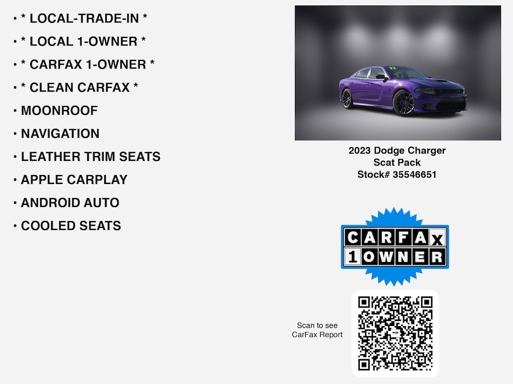 Free CARFAX report! DESIRABLE FEATURES: * CLEAN CARFAX *, * CARFAX 1-OWNER *, * LOCAL-TRADE-IN *, * LOCAL 1-OWNER *, Alcantara Seat, NAVIGATION, LEATHER TRIM SEATS, MOONROOF, APPLE CARPLAY, ANDROID AUTO, COOLED SEATS, LANE-DEPARTURE WARNING, CROSS-TRAFFIC ALERTS, REMOTE START, BLIND-SPOT MONITORING, BACKUP CAMERA, MULTI-ZONE AC, BLUETOOTH, VOICE CONTROLS, ALLOY-WHEELS, HOMELINK, BACKUP-SENSORS, FOG LAMPS, WiFi Hotspot, SiriusXM, usb, Remote entry. Your 2023 Dodge Charger Scat Pack is perfect for daily work or weekend road trips to our neighboring communities of Lancaster, Columbus, Newark, Pickerington, and Logan.Hugh White Chevrolet of Lancaster also offers extended vehicle service contracts so our Lancaster, OH area drivers enjoy a worry-free used car, SUV or van ownership experience. We proudly serve the counties of Fairfield, Hocking, Perry, Licking, and Pickaway with quality pre-owned vehicles Ohio drivers can trust.