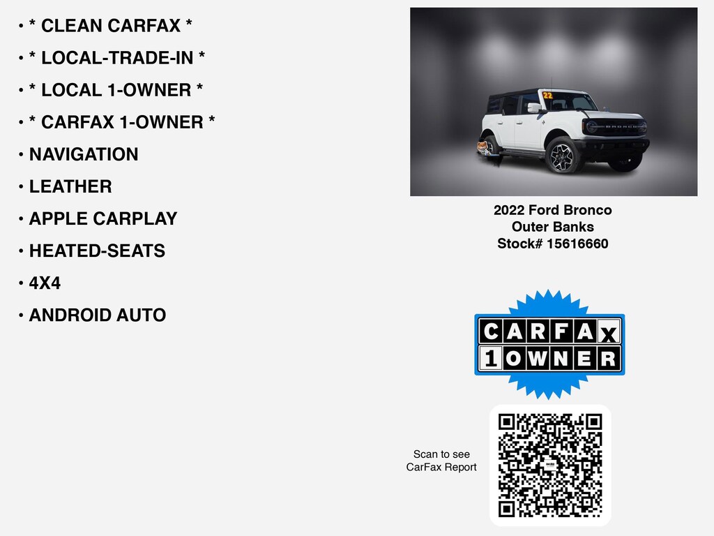 PRICED $1235 BELOW KBB FAIR PURCHASE PRICE!!!===== Discover Ford Bronco Outer Banks Exceptional Savings at Hugh White Chevrolet Lancaster! =====If you are ready to finance your next used vehicle near Lancaster, Pickerington, Circleville, and Logan, Hugh White Chevrolet Lancaster is thrilled to offer you a competitive finance offer on this 2022 Ford Bronco Outer Banks. Here is how the monthly payment of $518.86 is calculated for well qualified buyers shopping Hugh White Chevrolet Lancaster with Tier 1 credit: * Total Due at Signing: $3,421.00 * Security Deposit: $0.00 * Total Payments: $37,357.92 over the loan term * Loan Term: 72 months * Vehicle Price: $34,217.00This and other GM finance offers leverage the benefits of GM Financial. Call or drive in for GM finance deals like this stunning 2022 Ford Bronco with finance options near Lancaster! This Bronco is also available for sale near Pickerington, Circleville, and Logan. These GM finance specials end 1/31/2026 Disclaimer: Finance this 2022 Ford Bronco Outer Banks (Model E5B, VIN 1FMEE5BP8NLB48445). Selling price $34,217.00, with $3,421.00 down at $518.86 for 72 months at 6.58% APR, on approved credit. Total payments: $37,357.92. Must finance through Ally Loan. $15.16 per $1,000 financed. Excludes tax, title, registration, license, and $250 dealer doc fee. Offer assumes these paid at time of sale. Offer cannot be combined with any other offers. Residential restrictions may apply. Available on in-stock units only. See dealer for complete details. Offer Expires: 01/31/2026.CARFAX VERIFIED 1-OWNER. Free CARFAX report! *DESIRABLE FEATURES:* * CLEAN CARFAX *, * LOCAL 1-OWNER *, * CARFAX 1-OWNER *, * LOCAL-TRADE-IN *, SOFT TOP, LEATHER, APPLE CARPLAY, NAVIGATION, 4X4, ANDROID AUTO, HEATED-SEATS, REMOTE START, LANE-DEPARTURE WARNING, VOICE CONTROLS, BLUETOOTH, BACKUP CAMERA, BACKUP-SENSORS, usb, Remote entry, SiriusXM. Your 2022 Ford Bronco Outer Banks is perfect for daily work or weekend road trips to our neighboring communities of Lancaster, Columbus, Newark, Pickerington, and Logan.Hugh White Chevrolet of Lancaster also offers extended vehicle service contracts so our Lancaster, OH area drivers enjoy a worry-free used car, SUV or van ownership experience. We proudly serve the counties of Fairfield, Hocking, Perry, Licking, and Pickaway with quality pre-owned vehicles Ohio drivers can trust.This 4x4 2022 Ford Bronco Outer Banks has 73,311 miles and a bold Oxford White exterior with a comfortable Roast W/black Onyx Interior.*Our Car Dealership in Lancaster, OH:* Call Hugh White Chevrolet of Lancaster today at *(740) 640-6850 TO SCHEDULE YOUR TEST DRIVE* of this 2022 Ford Bronco Outer Banks. You can also visit us at 2510 N Memorial Dr. Lancaster, OH 45701 to check it out in person!*MECHANICAL FEATURES:* This Ford Bronco comes factory equipped with an impressive 2.7l ecoboost v6 engine, and a 10-speed automatic transmission. Hugh White Chevrolet of Lancaster is southern Ohio's location where you can test drive a GM certified vehicle and depend on us for service, parts, and accessories. We serve drivers from Pickerington, Circleville, Logan, and throughout Hocking and Perry County.*SAFETY OPTIONS:* Electronic Stability Control, Aftermarket Anti Theft System, Brake Assist, Emergency SOS system, Security System, ABS Brakes, Rollover Protection System, Overhead airbag, Dual Air Bags, Auto Highbeams, Tire Pressure Monitoring System, Delay-off headlights, Low tire pressure warning, Driver Front Side Impact Air Bag, Passenger Air Bag Sensor. This 2022 Ford Bronco Outer Banks comes standard with peace of mind for any driving conditionsWhen shopping for used cars, shoppers prefer the short drive to Lancaster. We're glad you found this pre-owned Ford Bronco for sale at our car dealership in Lancaster, OH. Looking for financing? Our Hugh White Chevrolet of Lancaster finance specialists will find the best rates available. So, if you're shopping used car dealerships in Lancaster, OH consider