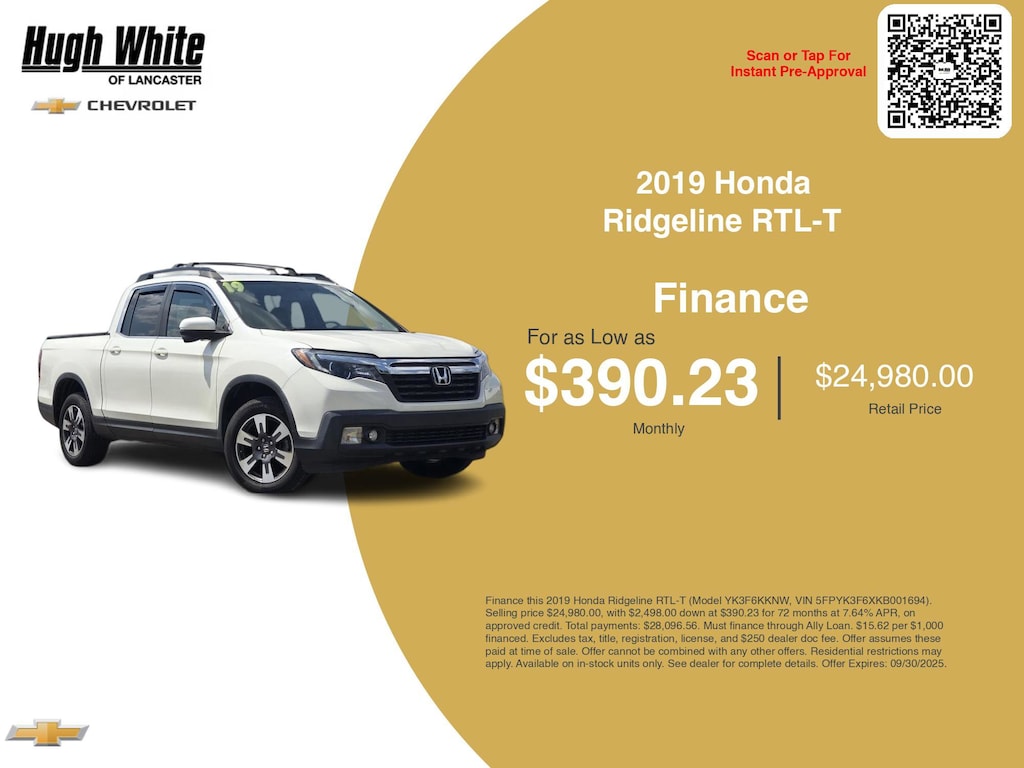 This and other GM finance offers leverage the benefits of GM Financial. Call or drive in for GM finance deals like this stunning 2019 Honda Ridgeline with finance options near Lancaster! This Ridgeline is also available for sale near Pickerington, Circleville, and Logan. These GM finance specials end 9/30/2025 Disclaimer: Finance this 2019 Honda Ridgeline RTL-T (Model YK3F6KKNW, VIN 5FPYK3F6XKB001694). Selling price $24,980.00, with $2,498.00 down at $390.23 for 72 months at 7.64% APR, on approved credit. Total payments: $28,096.56. Must finance through Ally Loan. $15.62 per $1,000 financed. Excludes tax, title, registration, license, and $250 dealer doc fee. Offer assumes these paid at time of sale. Offer cannot be combined with any other offers. Residential restrictions may apply. Available on in-stock units only. See dealer for complete details. Offer Expires: 09/30/2025.