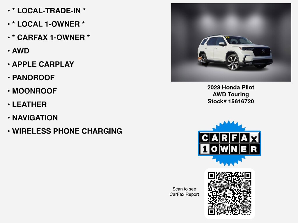 PRICED $4460 BELOW KBB FAIR PURCHASE PRICE!!!===== Discover Honda Pilot AWD Touring Exceptional Savings at Hugh White Chevrolet Lancaster! =====If you are ready to finance your next used vehicle near Lancaster, Pickerington, Circleville, and Logan, Hugh White Chevrolet Lancaster is thrilled to offer you a competitive finance offer on this 2023 Honda Pilot AWD Touring. Here is how the monthly payment of $515.26 is calculated for well qualified buyers shopping Hugh White Chevrolet Lancaster with Tier 1 credit: * Total Due at Signing: $3,398.00 * Security Deposit: $0.00 * Total Payments: $37,098.72 over the loan term * Loan Term: 72 months * Vehicle Price: $33,980.00This and other GM finance offers leverage the benefits of GM Financial. Call or drive in for GM finance deals like this stunning 2023 Honda Pilot with finance options near Lancaster! This Pilot is also available for sale near Pickerington, Circleville, and Logan. These GM finance specials end 1/31/2026 Disclaimer: Finance this 2023 Honda Pilot AWD Touring (Model YG1H7PKNW, VIN 5FNYG1H78PB045320). Selling price $33,980.00, with $3,398.00 down at $515.26 for 72 months at 6.58% APR, on approved credit. Total payments: $37,098.72. Must finance through Ally Loan. $15.16 per $1,000 financed. Excludes tax, title, registration, license, and $250 dealer doc fee. Offer assumes these paid at time of sale. Offer cannot be combined with any other offers. Residential restrictions may apply. Available on in-stock units only. See dealer for complete details. Offer Expires: 01/31/2026.CARFAX VERIFIED 1-OWNER. Free CARFAX report! *DESIRABLE FEATURES:* * LOCAL 1-OWNER *, * LOCAL-TRADE-IN *, * CARFAX 1-OWNER *, LEATHER, AWD, NAVIGATION, MOONROOF, PANOROOF, APPLE CARPLAY, WIRELESS PHONE CHARGING, ANDROID AUTO, HEATED-SEATS, 3RD ROW SEAT, REMOTE START, LANE-DEPARTURE WARNING, BLUETOOTH, HANDS-FREE LIFTGATE, BACKUP CAMERA, MULTI-ZONE AC, BLIND-SPOT MONITORING, REAR HEAT/AC, BACKUP-SENSORS, POWER REAR LIFTGATE, ALLOY-WHEELS, HOMELINK, FOG LAMPS, SiriusXM, Remote entry. Your 2023 Honda Pilot AWD Touring is perfect for daily work or weekend road trips to our neighboring communities of Lancaster, Columbus, Newark, Pickerington, and Logan.Hugh White Chevrolet of Lancaster also offers extended vehicle service contracts so our Lancaster, OH area drivers enjoy a worry-free used car, SUV or van ownership experience. We proudly serve the counties of Fairfield, Hocking, Perry, Licking, and Pickaway with quality pre-owned vehicles Ohio drivers can trust.*Our Car Dealership in Lancaster, OH:* Call Hugh White Chevrolet of Lancaster today at *(740) 640-6850 TO SCHEDULE YOUR TEST DRIVE* of this 2023 Honda Pilot AWD Touring. You can also visit us at 2510 N Memorial Dr. Lancaster, OH 45701 to check it out in person!*MECHANICAL FEATURES:* This Honda Pilot comes factory equipped with an impressive 3.5l v6 dohc 24v engine, and a 10-speed automatic transmission. Hugh White Chevrolet of Lancaster is southern Ohio's location where you can test drive a GM certified vehicle and depend on us for service, parts, and accessories. We serve drivers from Pickerington, Circleville, Logan, and throughout Hocking and Perry County.*SAFETY OPTIONS:* Electronic Stability Control, Lane Keeping Assist System, Integrated Turn Signal Mirrors, Adaptive Cruise Control, Brake Assist, Security System, Emergency SOS system, Aftermarket Anti Theft System, Delay-off headlights, Knee AirBag, Auto Highbeams, Speed Sensitive Power Steering, ABS Brakes, Overhead airbag, Tire Pressure Monitoring System, Dual Air Bags, Low tire pressure warning, Passenger Air Bag Sensor, Driver Front Side Impact Air Bag. This 2023 Honda Pilot AWD Touring comes standard with peace of mind for any driving conditionsWhen shopping for used cars, shoppers prefer the short drive to Lancaster. We're glad you found this pre-owned Honda Pilot for sale at our car dealership in Lancaster, OH. Looking for financing? Our Hugh White Chevrolet of Lancaster finance specia
