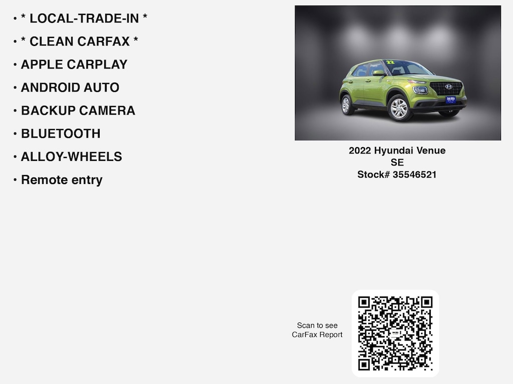PRICED $2720 BELOW KBB FAIR PURCHASE PRICE!!!===== Discover Hyundai Venue SE Exceptional Savings at Hugh White Chevrolet Lancaster! =====If you are ready to finance your next used vehicle near Lancaster, Pickerington, Circleville, and Logan, Hugh White Chevrolet Lancaster is thrilled to offer you a competitive finance offer on this 2022 Hyundai Venue SE. Here is how the monthly payment of $227.92 is calculated for well qualified buyers shopping Hugh White Chevrolet Lancaster with Tier 1 credit: * Total Due at Signing: $1,498.00 * Security Deposit: $0.00 * Total Payments: $16,410.24 over the loan term * Loan Term: 72 months * Vehicle Price: $14,980.00This and other GM finance offers leverage the benefits of GM Financial. Call or drive in for GM finance deals like this stunning 2022 Hyundai Venue with finance options near Lancaster! This Venue is also available for sale near Pickerington, Circleville, and Logan. These GM finance specials end 12/31/2025 Disclaimer: Finance this 2022 Hyundai Venue SE (Model 30402F45, VIN KMHRB8A30NU164482). Selling price $14,980.00, with $1,498.00 down at $227.92 for 72 months at 6.70% APR, on approved credit. Total payments: $16,410.24. Must finance through Ally Loan. $15.21 per $1,000 financed. Excludes tax, title, registration, license, and $250 dealer doc fee. Offer assumes these paid at time of sale. Offer cannot be combined with any other offers. Residential restrictions may apply. Available on in-stock units only. See dealer for complete details. Offer Expires: 12/31/2025.Free CARFAX report! *DESIRABLE FEATURES:* * CLEAN CARFAX *, * LOCAL-TRADE-IN *, APPLE CARPLAY, ANDROID AUTO, BLUETOOTH, BACKUP CAMERA, ALLOY-WHEELS, Remote entry. Your 2022 Hyundai Venue SE is perfect for daily work or weekend road trips to our neighboring communities of Lancaster, Columbus, Newark, Pickerington, and Logan.Hugh White Chevrolet of Lancaster also offers extended vehicle service contracts so our Lancaster, OH area drivers enjoy a worry-free used car, SUV or van ownership experience. We proudly serve the counties of Fairfield, Hocking, Perry, Licking, and Pickaway with quality pre-owned vehicles Ohio drivers can trust.This fwd 2022 Hyundai Venue SE has 26,292 miles and a bold Green Apple exterior with a comfortable Black Interior.*Our Car Dealership in Lancaster, OH:* Call Hugh White Chevrolet of Lancaster today at *(740) 640-6850 TO SCHEDULE YOUR TEST DRIVE* of this 2022 Hyundai Venue SE. You can also visit us at 2510 N Memorial Dr. Lancaster, OH 45701 to check it out in person!*MECHANICAL FEATURES:* This Hyundai Venue comes factory equipped with an impressive i4 engine, and a cvt transmission. Hugh White Chevrolet of Lancaster is southern Ohio's location where you can test drive a GM certified vehicle and depend on us for service, parts, and accessories. We serve drivers from Pickerington, Circleville, Logan, and throughout Hocking and Perry County.*SAFETY OPTIONS:* Electronic Stability Control, Aftermarket Anti Theft System, Security System, Brake Assist, Tire Pressure Monitoring System, Dual Air Bags, Delay-off headlights, Speed Sensitive Power Steering, Overhead airbag, ABS Brakes, Auto Highbeams, Driver Front Side Impact Air Bag, Low tire pressure warning, Passenger Air Bag Sensor. This 2022 Hyundai Venue SE comes standard with peace of mind for any driving conditionsWhen shopping for used cars, shoppers prefer the short drive to Lancaster. We're glad you found this pre-owned Hyundai Venue for sale at our car dealership in Lancaster, OH. Looking for financing? Our Hugh White Chevrolet of Lancaster finance specialists will find the best rates available. So, if you're shopping used car dealerships in Lancaster, OH consider driving to Hugh White Chevrolet where you'll experience excellent dealer service & sales.