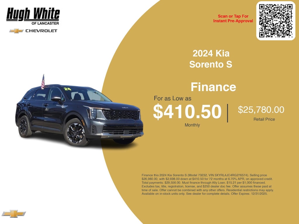 This and other GM finance offers leverage the benefits of GM Financial. Call or drive in for GM finance deals like this stunning 2024 Kia Sorento with finance options near Lancaster! This Sorento is also available for sale near Pickerington, Circleville, and Logan. These GM finance specials end 12/31/2025 Disclaimer: Finance this 2024 Kia Sorento S (Model 73232, VIN 5XYRL4JC4RG276574). Selling price $26,980.00, with $2,698.00 down at $410.50 for 72 months at 6.70% APR, on approved credit. Total payments: $29,556.00. Must finance through Ally Loan. $15.21 per $1,000 financed. Excludes tax, title, registration, license, and $250 dealer doc fee. Offer assumes these paid at time of sale. Offer cannot be combined with any other offers. Residential restrictions may apply. Available on in-stock units only. See dealer for complete details. Offer Expires: 12/31/2025.