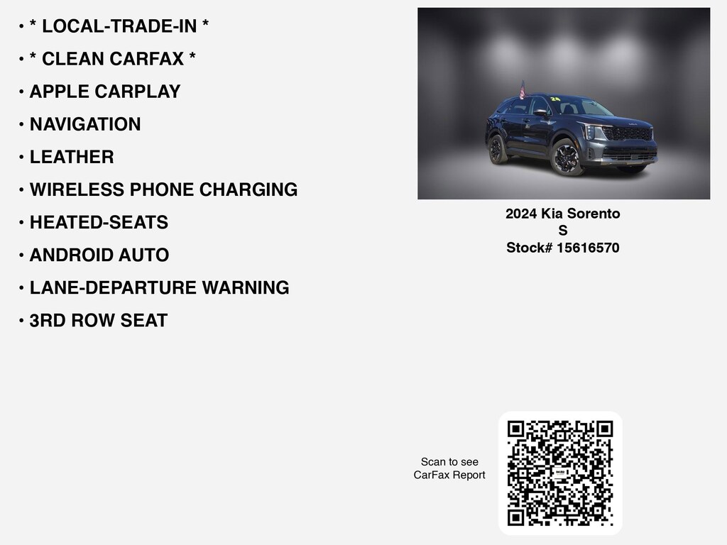 Free CARFAX report! DESIRABLE FEATURES: * LOCAL-TRADE-IN *, * CLEAN CARFAX *, NAVIGATION, LEATHER, APPLE CARPLAY, WIRELESS PHONE CHARGING, ANDROID AUTO, HEATED-SEATS, 3RD ROW SEAT, LANE-DEPARTURE WARNING, MULTI-ZONE AC, BLIND-SPOT MONITORING, BACKUP CAMERA, BLUETOOTH, BACKUP-SENSORS, FOG LAMPS, ALLOY-WHEELS, SiriusXM, Remote entry. Your 2024 Kia Sorento S is perfect for daily work or weekend road trips to our neighboring communities of Lancaster, Columbus, Newark, Pickerington, and Logan.Hugh White Chevrolet of Lancaster also offers extended vehicle service contracts so our Lancaster, OH area drivers enjoy a worry-free used car, SUV or van ownership experience. We proudly serve the counties of Fairfield, Hocking, Perry, Licking, and Pickaway with quality pre-owned vehicles Ohio drivers can trust.