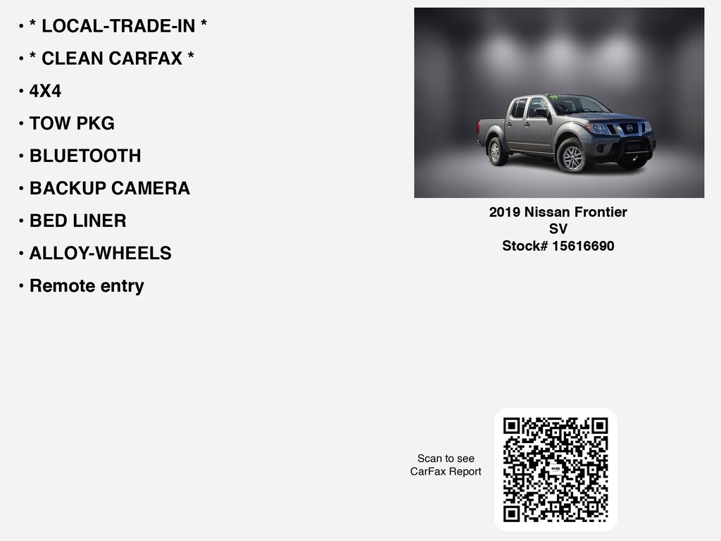 PRICED $1535 BELOW KBB FAIR PURCHASE PRICE!!!===== Discover Nissan Frontier SV Exceptional Savings at Hugh White Chevrolet Lancaster! =====If you are ready to finance your next used vehicle near Lancaster, Pickerington, Circleville, and Logan, Hugh White Chevrolet Lancaster is thrilled to offer you a competitive finance offer on this 2019 Nissan Frontier SV. Here is how the monthly payment of $295.09 is calculated for well qualified buyers shopping Hugh White Chevrolet Lancaster with Tier 1 credit: * Total Due at Signing: $1,899.00 * Security Deposit: $0.00 * Total Payments: $21,246.48 over the loan term * Loan Term: 72 months * Vehicle Price: $18,990.00This and other GM finance offers leverage the benefits of GM Financial. Call or drive in for GM finance deals like this stunning 2019 Nissan Frontier with finance options near Lancaster! This Frontier is also available for sale near Pickerington, Circleville, and Logan. These GM finance specials end 1/31/2026 Disclaimer: Finance this 2019 Nissan Frontier SV (Model 32219, VIN 1N6AD0EV0KN701640). Selling price $18,990.00, with $1,899.00 down at $295.09 for 72 months at 7.45% APR, on approved credit. Total payments: $21,246.48. Must finance through Ally Loan. $15.54 per $1,000 financed. Excludes tax, title, registration, license, and $250 dealer doc fee. Offer assumes these paid at time of sale. Offer cannot be combined with any other offers. Residential restrictions may apply. Available on in-stock units only. See dealer for complete details. Offer Expires: 01/31/2026.Free CARFAX report! *DESIRABLE FEATURES:* * CLEAN CARFAX *, * LOCAL-TRADE-IN *, 4X4, TOW PKG, BED LINER, BACKUP CAMERA, BLUETOOTH, ALLOY-WHEELS, Remote entry. Your 2019 Nissan Frontier SV is perfect for daily work or weekend road trips to our neighboring communities of Lancaster, Columbus, Newark, Pickerington, and Logan.Hugh White Chevrolet of Lancaster also offers extended vehicle service contracts so our Lancaster, OH area drivers enjoy a worry-free used car, SUV or van ownership experience. We proudly serve the counties of Fairfield, Hocking, Perry, Licking, and Pickaway with quality pre-owned vehicles Ohio drivers can trust.This 4x4 2019 Nissan Frontier SV has 83,726 miles and a bold Gun Metallic exterior with a comfortable Steel Interior.*Our Car Dealership in Lancaster, OH:* Call Hugh White Chevrolet of Lancaster today at *(740) 640-6850 TO SCHEDULE YOUR TEST DRIVE* of this 2019 Nissan Frontier SV. You can also visit us at 2510 N Memorial Dr. Lancaster, OH 45701 to check it out in person!*MECHANICAL FEATURES:* This Nissan Frontier comes factory equipped with an impressive 4.0l v6 dohc engine, and a 5-speed automatic with overdrive transmission. Hugh White Chevrolet of Lancaster is southern Ohio's location where you can test drive a GM certified vehicle and depend on us for service, parts, and accessories. We serve drivers from Pickerington, Circleville, Logan, and throughout Hocking and Perry County.*SAFETY OPTIONS:* Electronic Stability Control, ABS Brakes, Tire Pressure Monitoring System, Speed Sensitive Power Steering, Overhead airbag, Dual Air Bags, Driver Front Side Impact Air Bag, Front anti-whiplash head restraints, Low tire pressure warning, Passenger Air Bag Sensor. This 2019 Nissan Frontier SV comes standard with peace of mind for any driving conditionsWhen shopping for used cars, shoppers prefer the short drive to Lancaster. We're glad you found this pre-owned Nissan Frontier for sale at our car dealership in Lancaster, OH. Looking for financing? Our Hugh White Chevrolet of Lancaster finance specialists will find the best rates available. So, if you're shopping used car dealerships in Lancaster, OH consider driving to Hugh White Chevrolet where you'll experience excellent dealer service & sales.