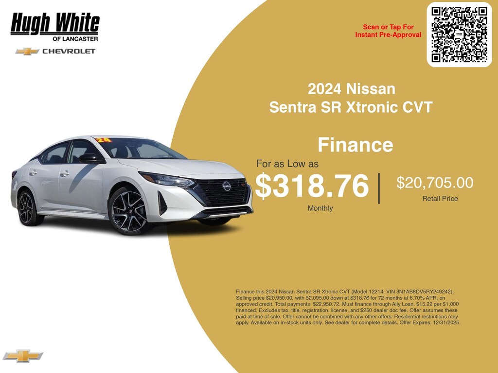 PRICED $1530 BELOW KBB FAIR PURCHASE PRICE!!!===== Discover Nissan Sentra SR Xtronic CVT Exceptional Savings at Hugh White Chevrolet Lancaster! =====If you are ready to finance your next used vehicle near Lancaster, Pickerington, Circleville, and Logan, Hugh White Chevrolet Lancaster is thrilled to offer you a competitive finance offer on this 2024 Nissan Sentra SR Xtronic CVT. Here is how the monthly payment of $318.76 is calculated for well qualified buyers shopping Hugh White Chevrolet Lancaster with Tier 1 credit: * Total Due at Signing: $2,095.00 * Security Deposit: $0.00 * Total Payments: $22,950.72 over the loan term * Loan Term: 72 months * Vehicle Price: $20,705.00This and other GM finance offers leverage the benefits of GM Financial. Call or drive in for GM finance deals like this stunning 2024 Nissan Sentra with finance options near Lancaster! This Sentra is also available for sale near Pickerington, Circleville, and Logan. These GM finance specials end 12/31/2025 Disclaimer: Finance this 2024 Nissan Sentra SR Xtronic CVT (Model 12214, VIN 3N1AB8DV5RY249242). Selling price $20,950.00, with $2,095.00 down at $318.76 for 72 months at 6.70% APR, on approved credit. Total payments: $22,950.72. Must finance through Ally Loan. $15.22 per $1,000 financed. Excludes tax, title, registration, license, and $250 dealer doc fee. Offer assumes these paid at time of sale. Offer cannot be combined with any other offers. Residential restrictions may apply. Available on in-stock units only. See dealer for complete details. Offer Expires: 12/31/2025.CARFAX VERIFIED 1-OWNER. Free CARFAX report! *DESIRABLE FEATURES:* * LOCAL 1-OWNER *, * CARFAX 1-OWNER *, * LOCAL-TRADE-IN *, * 1-OWNER *, SOLD HERE NEW, APPLE CARPLAY, ANDROID AUTO, HEATED-SEATS, REMOTE START, LANE-DEPARTURE WARNING, MULTI-ZONE AC, BLUETOOTH, BACKUP CAMERA, BLIND-SPOT MONITORING, ALLOY-WHEELS, BACKUP-SENSORS, Remote entry, SiriusXM. Your 2024 Nissan Sentra SR Xtronic CVT is perfect for daily work or weekend road trips to our neighboring communities of Lancaster, Columbus, Newark, Pickerington, and Logan.Hugh White Chevrolet of Lancaster also offers extended vehicle service contracts so our Lancaster, OH area drivers enjoy a worry-free used car, SUV or van ownership experience. We proudly serve the counties of Fairfield, Hocking, Perry, Licking, and Pickaway with quality pre-owned vehicles Ohio drivers can trust.This fwd 2024 Nissan Sentra SR Xtronic CVT has 12,421 miles and a bold Aspen White Tricoat exterior with a comfortable Sport Interior.*Our Car Dealership in Lancaster, OH:* Call Hugh White Chevrolet of Lancaster today at *(740) 640-6850 TO SCHEDULE YOUR TEST DRIVE* of this 2024 Nissan Sentra SR Xtronic CVT. You can also visit us at 2510 N Memorial Dr. Lancaster, OH 45701 to check it out in person!*MECHANICAL FEATURES:* This Nissan Sentra comes factory equipped with an impressive 2.0l i4 dohc engine, and a cvt with xtronic transmission. Hugh White Chevrolet of Lancaster is southern Ohio's location where you can test drive a GM certified vehicle and depend on us for service, parts, and accessories. We serve drivers from Pickerington, Circleville, Logan, and throughout Hocking and Perry County.*SAFETY OPTIONS:* Rear Parking Aid, Electronic Stability Control, Integrated Turn Signal Mirrors, Brake Assist, Security System, Aftermarket Anti Theft System, Auto Highbeams, Tire Pressure Monitoring System, Speed Sensitive Power Steering, Knee AirBag, ABS Brakes, Dual Air Bags, Overhead airbag, Delay-off headlights, Passenger Air Bag Sensor, Low tire pressure warning, Driver Front Side Impact Air Bag. This 2024 Nissan Sentra SR Xtronic CVT comes standard with peace of mind for any driving conditionsWhen shopping for used cars, shoppers prefer the short drive to Lancaster. We're glad you found this pre-owned Nissan Sentra for sale at our car dealership in Lancaster, OH. Looking for financing? Our Hugh White Chevrolet of Lancaster finance specialists will find the best rate
