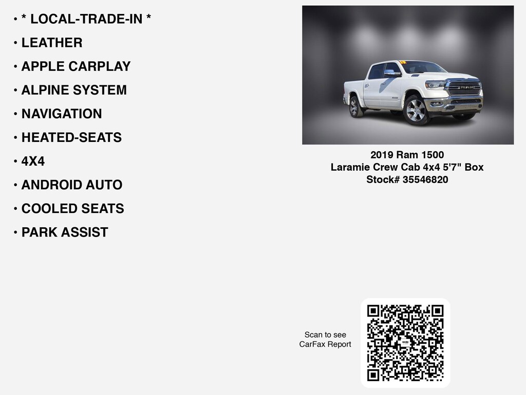 Free CARFAX report! DESIRABLE FEATURES: * LOCAL-TRADE-IN *, LEATHER, APPLE CARPLAY, NAVIGATION, ALPINE SYSTEM, COOLED SEATS, HEATED-SEATS, ANDROID AUTO, PARK ASSIST, 4X4, HEATED-STEERING WHEEL, TOW PKG, REMOTE START, CROSS-TRAFFIC ALERTS, MULTI-ZONE AC, BLIND-SPOT MONITORING, BLUETOOTH, BED LINER, BACKUP CAMERA, TONNEAU-COVER, BACKUP-SENSORS, ALLOY-WHEELS, FOG LAMPS, Remote entry, SiriusXM, usb. Your 2019 Ram 1500 Laramie Crew Cab 4x4 5'7" Box is perfect for daily work or weekend road trips to our neighboring communities of Lancaster, Columbus, Newark, Pickerington, and Logan.Hugh White Chevrolet of Lancaster also offers extended vehicle service contracts so our Lancaster, OH area drivers enjoy a worry-free used car, SUV or van ownership experience. We proudly serve the counties of Fairfield, Hocking, Perry, Licking, and Pickaway with quality pre-owned vehicles Ohio drivers can trust.