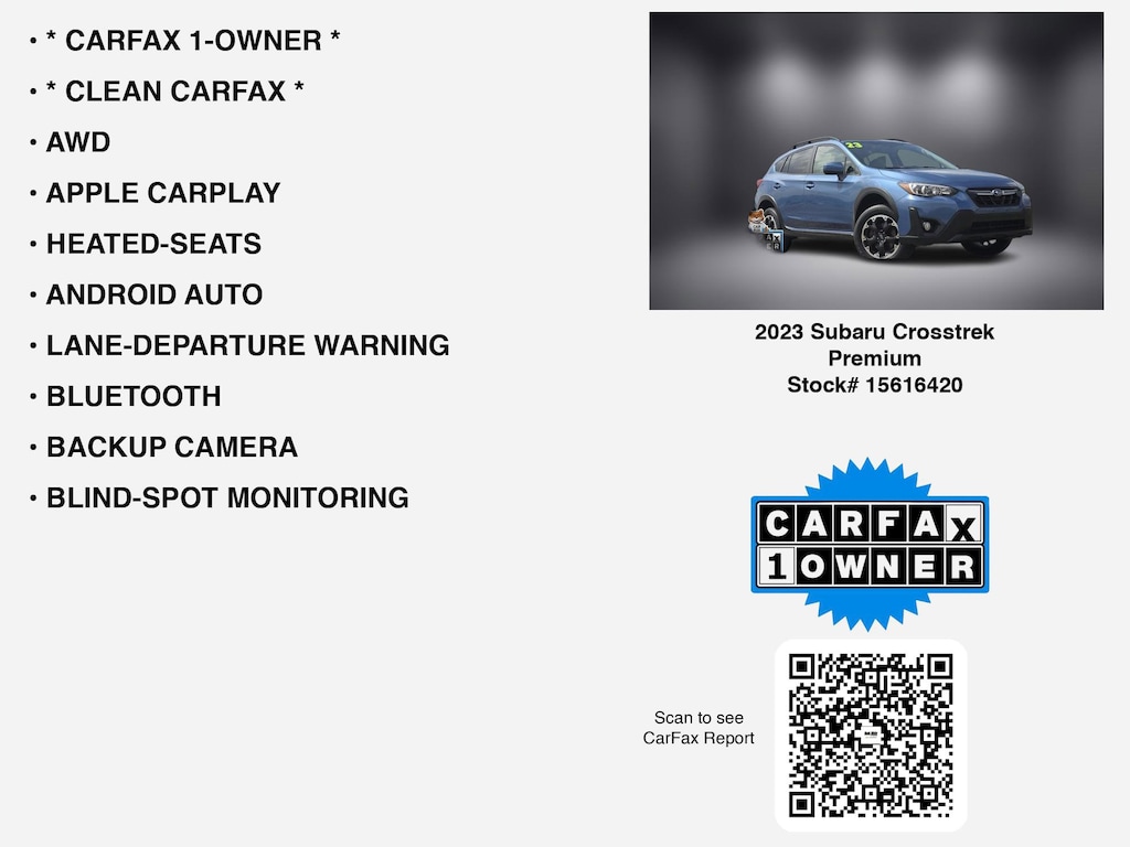 ===== Discover Subaru Crosstrek Premium Exceptional Savings at Hugh White Chevrolet Lancaster! =====If you are ready to finance your next used vehicle near Lancaster, Pickerington, Circleville, and Logan, Hugh White Chevrolet Lancaster is thrilled to offer you a competitive finance offer on this 2023 Subaru Crosstrek Premium. Here is how the monthly payment of $332.64 is calculated for well qualified buyers shopping Hugh White Chevrolet Lancaster with Tier 1 credit: * Total Due at Signing: $2,193.00 * Security Deposit: $0.00 * Total Payments: $23,950.08 over the loan term * Loan Term: 72 months * Vehicle Price: $21,936.00This and other GM finance offers leverage the benefits of GM Financial. Call or drive in for GM finance deals like this stunning 2023 Subaru Crosstrek with finance options near Lancaster! This Crosstrek is also available for sale near Pickerington, Circleville, and Logan. These GM finance specials end 12/31/2025 Disclaimer: Finance this 2023 Subaru Crosstrek Premium (Model PRD, VIN JF2GTAPC2PH206560). Selling price $21,936.00, with $2,193.00 down at $332.64 for 72 months at 6.58% APR, on approved credit. Total payments: $23,950.08. Must finance through Ally Loan. $15.16 per $1,000 financed. Excludes tax, title, registration, license, and $250 dealer doc fee. Offer assumes these paid at time of sale. Offer cannot be combined with any other offers. Residential restrictions may apply. Available on in-stock units only. See dealer for complete details. Offer Expires: 12/31/2025.CARFAX VERIFIED 1-OWNER. Free CARFAX report! *DESIRABLE FEATURES:* * CARFAX 1-OWNER *, * CLEAN CARFAX *, AWD, APPLE CARPLAY, ANDROID AUTO, HEATED-SEATS, LANE-DEPARTURE WARNING, BLIND-SPOT MONITORING, BACKUP CAMERA, BLUETOOTH, HOMELINK, FOG LAMPS, ALLOY-WHEELS, Remote entry, SiriusXM. Your 2023 Subaru Crosstrek Premium is perfect for daily work or weekend road trips to our neighboring communities of Lancaster, Columbus, Newark, Pickerington, and Logan.Hugh White Chevrolet of Lancaster also offers extended vehicle service contracts so our Lancaster, OH area drivers enjoy a worry-free used car, SUV or van ownership experience. We proudly serve the counties of Fairfield, Hocking, Perry, Licking, and Pickaway with quality pre-owned vehicles Ohio drivers can trust.This awd 2023 Subaru Crosstrek Premium has 34,761 miles and a bold Horizon Blue Pearl exterior with a comfortable Gray Interior.*Our Car Dealership in Lancaster, OH:* Call Hugh White Chevrolet of Lancaster today at *(740) 640-6850 TO SCHEDULE YOUR TEST DRIVE* of this 2023 Subaru Crosstrek Premium. You can also visit us at 2510 N Memorial Dr. Lancaster, OH 45701 to check it out in person!*MECHANICAL FEATURES:* This Subaru Crosstrek comes factory equipped with an impressive 2.0l 4-cylinder dohc 16v engine, and a lineartronic cvt transmission. Hugh White Chevrolet of Lancaster is southern Ohio's location where you can test drive a GM certified vehicle and depend on us for service, parts, and accessories. We serve drivers from Pickerington, Circleville, Logan, and throughout Hocking and Perry County.*SAFETY OPTIONS:* Electronic Stability Control, Brake Assist, Aftermarket Anti Theft System, Security System, Overhead airbag, Dual Air Bags, Tire Pressure Monitoring System, Speed Sensitive Power Steering, ABS Brakes, Front Head Restraints, Knee AirBag, Driver Front Side Impact Air Bag, Low tire pressure warning, Passenger Air Bag Sensor, Front anti-whiplash head restraints. This 2023 Subaru Crosstrek Premium comes standard with peace of mind for any driving conditionsWhen shopping for used cars, shoppers prefer the short drive to Lancaster. We're glad you found this pre-owned Subaru Crosstrek for sale at our car dealership in Lancaster, OH. Looking for financing? Our Hugh White Chevrolet of Lancaster finance specialists will find the best rates available. So, if you're shopping used car dealerships in Lancaster, OH consider driving to Hugh White Chevrolet where you'll experience excellent