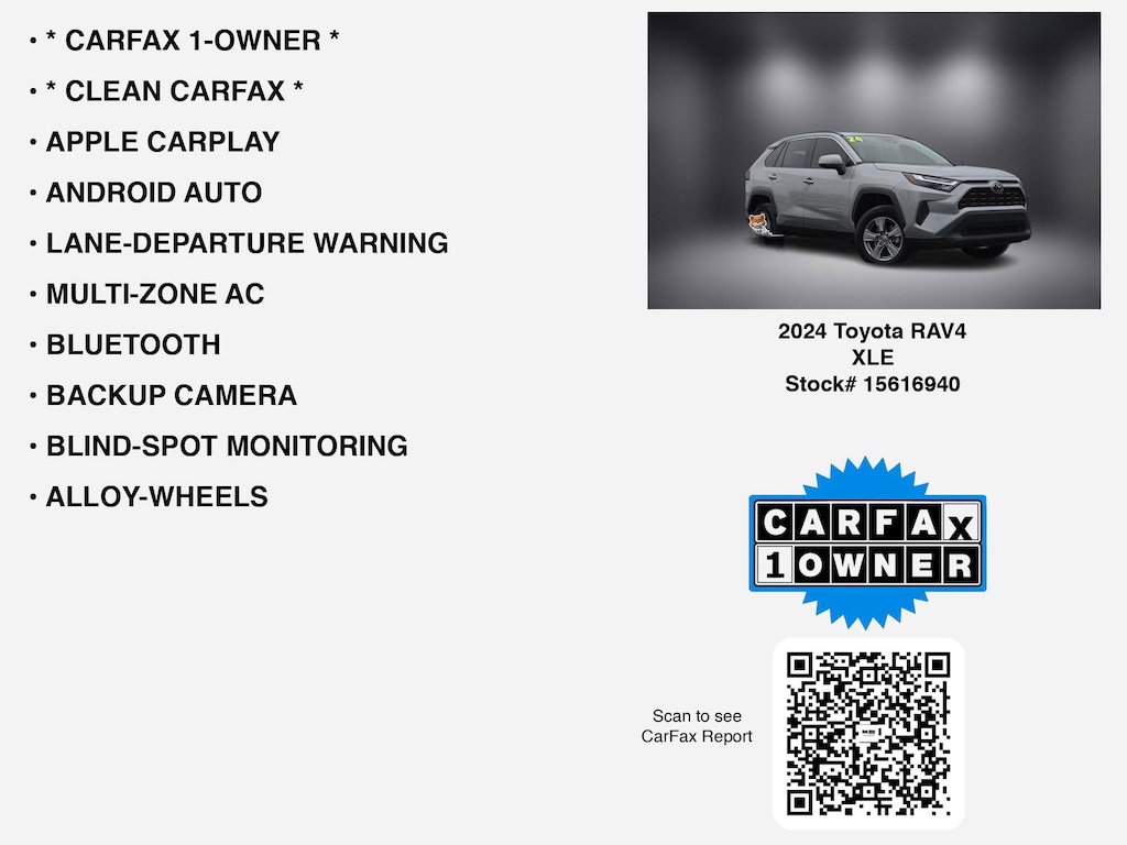 CARFAX VERIFIED 1-OWNER. Free CARFAX report! DESIRABLE FEATURES: * CARFAX 1-OWNER *, * CLEAN CARFAX *, APPLE CARPLAY, ANDROID AUTO, LANE-DEPARTURE WARNING, MULTI-ZONE AC, BLUETOOTH, BLIND-SPOT MONITORING, BACKUP CAMERA, ALLOY-WHEELS, Remote entry, SiriusXM. Your 2024 Toyota RAV4 XLE is perfect for daily work or weekend road trips to our neighboring communities of Lancaster, Columbus, Newark, Pickerington, and Logan.Hugh White Chevrolet of Lancaster also offers extended vehicle service contracts so our Lancaster, OH area drivers enjoy a worry-free used car, SUV or van ownership experience. We proudly serve the counties of Fairfield, Hocking, Perry, Licking, and Pickaway with quality pre-owned vehicles Ohio drivers can trust.